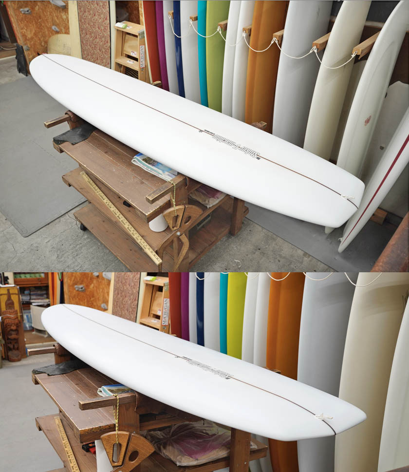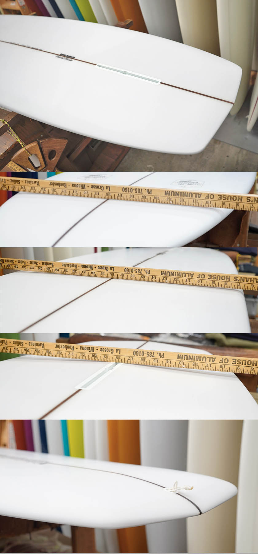 こちらV8モデルは、転換期のVボトムデザインを現代風にリファインし扱いやすいミッドレングスに進化した一本です。ロングボード波の安定感とテイクオフ性能、そしてワイドなテールながらも大胆なヴィー・ボトムのテールが気持ち良いシングルフィンのターンをしてくれそう。フィンの付属はありません。
