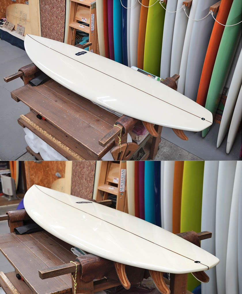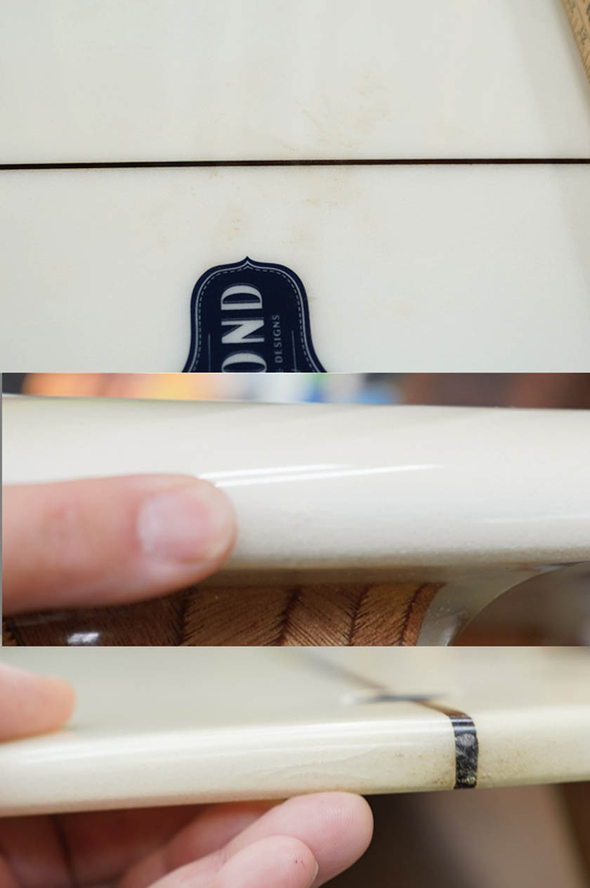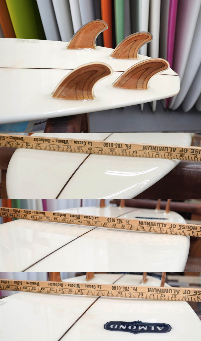ニュー・エボリューションのユーズド・サーフボードは、ショートレングスからロングボードまで、個性豊かで充実したラインナップ。出来る限り分かりやすいコンディションの説明で、開業より20年以上日本各地の多くの皆様に販売を続けております。 あくまでもユーズドなので、コンディションについて気になる点がある場合は、お気軽にメールにてお問い合わせください。 尚、出来るだけお求めやすい金額でご提案させていただけるよう、ユーズドボードにつきましては現金特価とさせていただいております。カード決済ご希望の場合は、ご相談ください。 Almond Q Kumber 5'10" * 20&1/8" * 2&3/8" Gloss & polish, clear, dark wood stringer, leash cup, glass oon wood quad fin. ユーズド、アーモンドの5’10”Qカンバーです。クラッシックな雰囲気のあるデザインながら、パフォーマンス性も良さそうな少し薄めのシェイプの一本。デッキには画像程度のまだそれほど乗り込まれた印象のないフットマーク、レールに小さな爪のかからない程度のディング一個程度、テールに僅かなヒビ、それとボトムにラミネート前の手の跡が少し見えている感じです。
