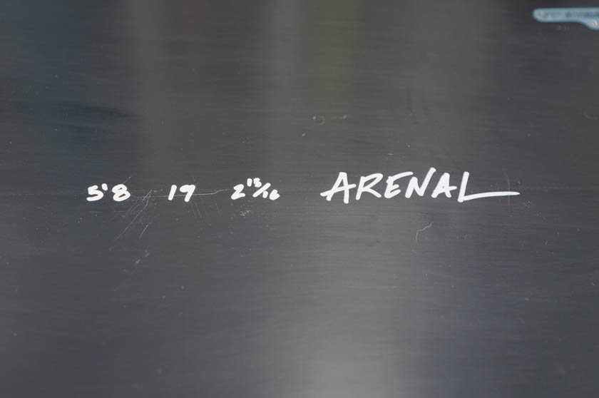 ユーズド、アレナルの5’8” アシメトリーボードです。大胆な左右非対称のボードで、両サイドの乗り味の違いを楽しめそうなシェイプの一本。ショートボードよりのボリューム感で楽しみたい方におすすめのシェイプですね。画像でイメージできますように、デッキ、ボトムやレール周りのある程度の使用感はございますが、乗り味を試すには良いのではないでしょうか。フィンセットの付属はありません。