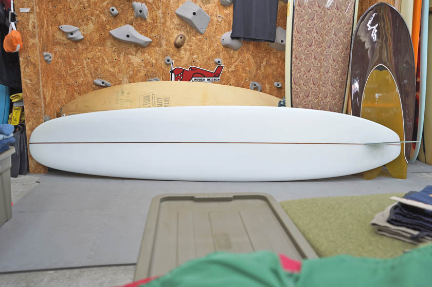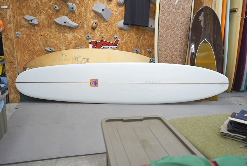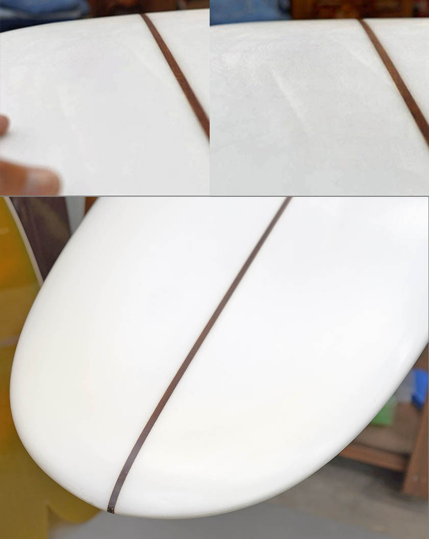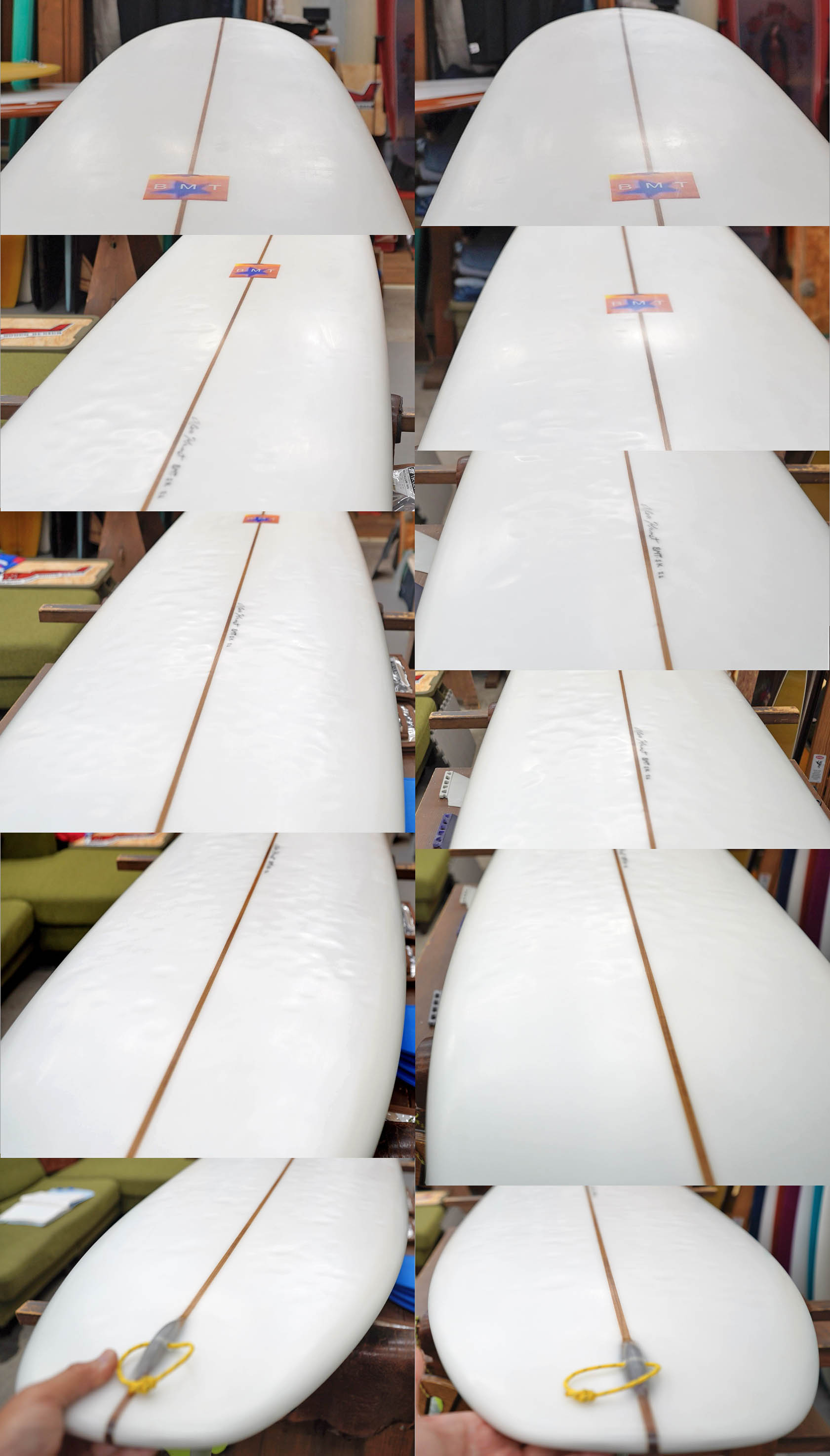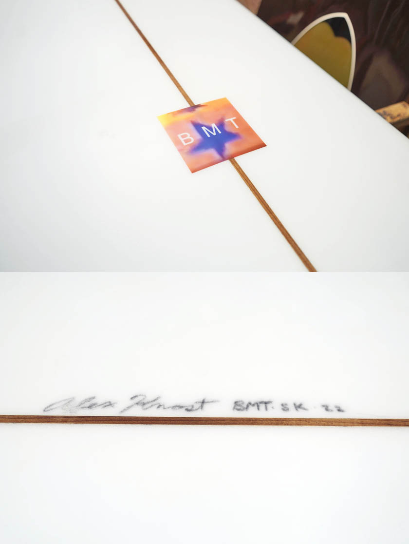 ユーズド、ブラウン・マイクロウェーブ・テレビジョン(BMT)の9’6”パーソナル・ログです。アレックス・ノストのハンドシェイプしたいわゆるシグネチャーモデル・タイプで、軽量な仕上がりのアレックスの様な軽快でスタイリッシュなマニューバーをさせてくれるボードになっている様です。デッキにはまだそれほど多くない使用回数分のフットマークが画像程度、そのほかボトムのノーズ寄りに縦目にやや斜めの線の様な短い僅かな凹みが2本ほどとノーズに僅かに色焼けが見受けられるコンディションでしょう。(ウォータータイトな印象の表面上の極浅い傷だと思います)グラスループやグラスオンフィンなどこだわりの詰まった一本です。