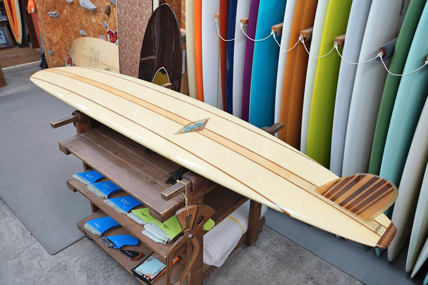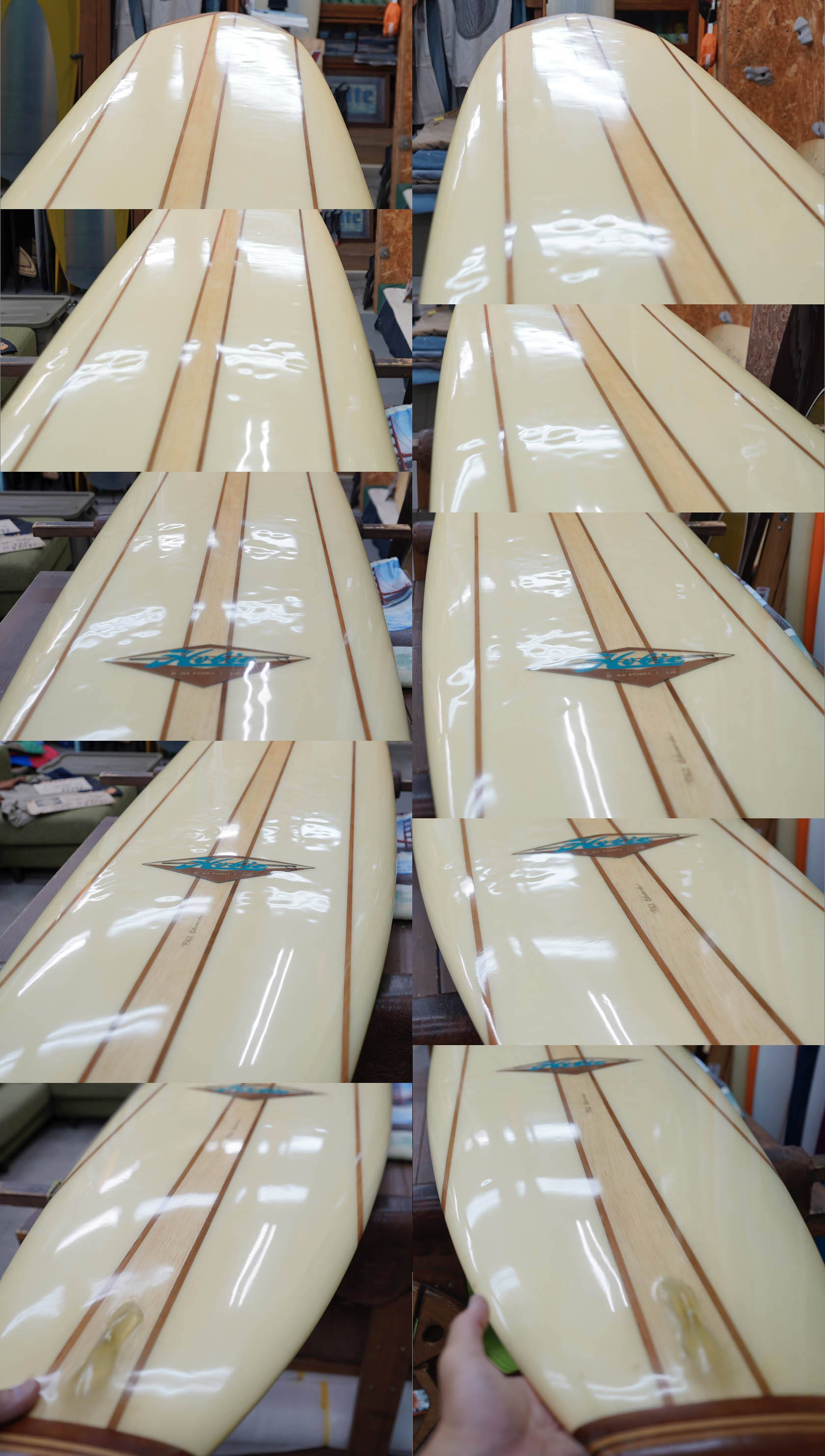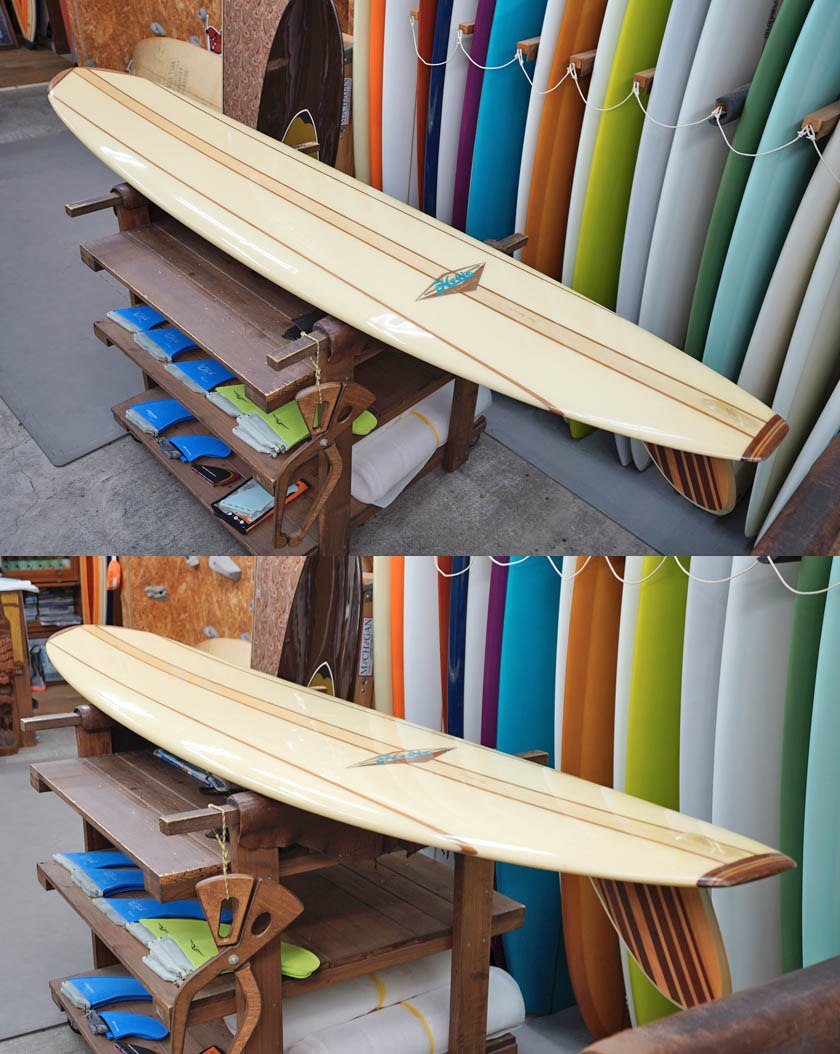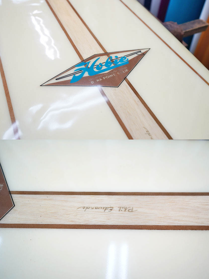ユーズド、ホビーの9’2”フィル・エドワーズ・モデルです。本人のシェイプサイン入りの個体です。トレードマークの凝ったマルチストリンガーが雰囲気満点の一本。こちらはとても珍しいクロスを乗せずに作られたノーズとテールの積層ウッドのブロックがつく上に、同じく美しい積層のハーフムーン・フィンがグラスオンされた、フルオプションのセミビンテージと言えるボードでしょう。画像のようなフットマーク、アタリや凹み、一部要リペアーの傷も見受けられるコンディションです。
