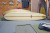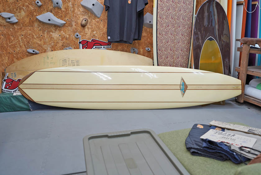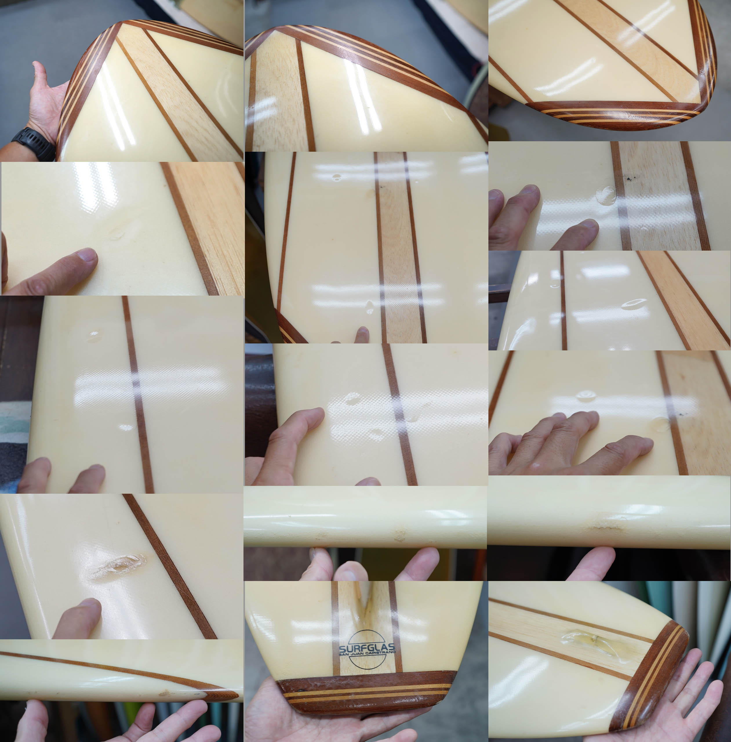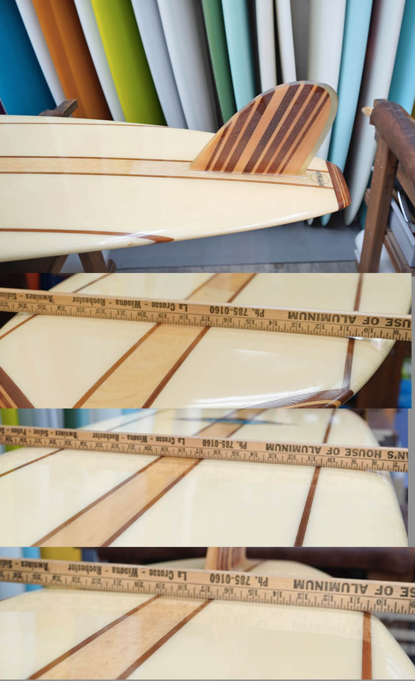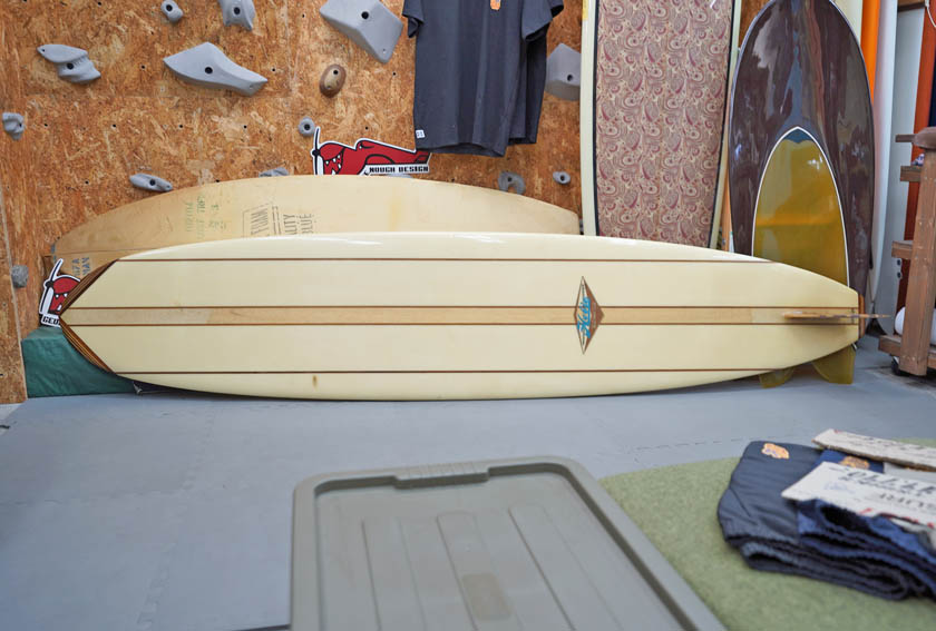 ユーズド、ホビーの9’2”フィル・エドワーズ・モデルです。本人のシェイプサイン入りの個体です。トレードマークの凝ったマルチストリンガーが雰囲気満点の一本。こちらはとても珍しいクロスを乗せずに作られたノーズとテールの積層ウッドのブロックがつく上に、同じく美しい積層のハーフムーン・フィンがグラスオンされた、フルオプションのセミビンテージと言えるボードでしょう。画像のようなフットマーク、アタリや凹み、一部要リペアーの傷も見受けられるコンディションです。