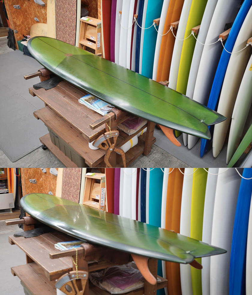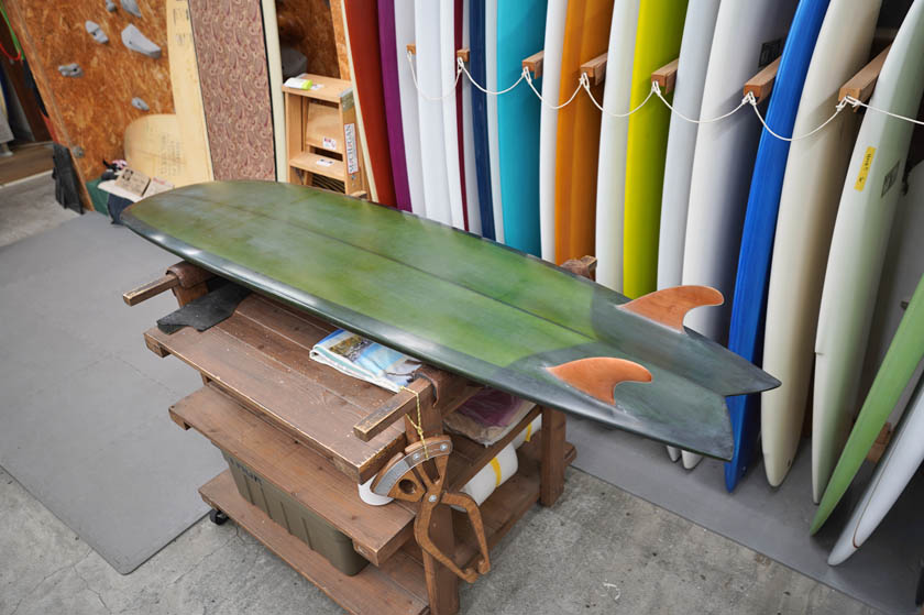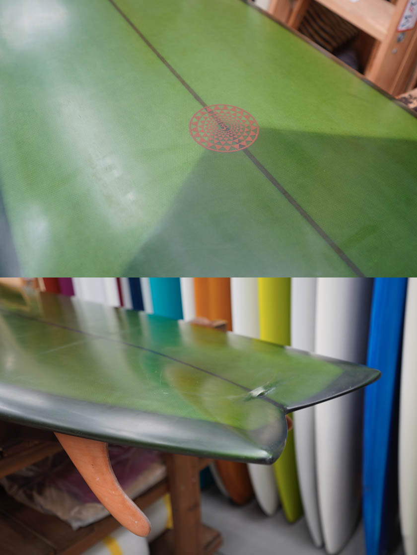 ニュー・エボリューションのユーズド・サーフボードは、ショートレングスからロングボードまで、個性豊かで充実したラインナップ。出来る限り分かりやすいコンディションの説明で、開業より20年以上日本各地の多くの皆様に販売を続けております。 あくまでもユーズドなので、コンディションについて気になる点がある場合は、お気軽にメールにてお問い合わせください。 尚、出来るだけお求めやすい金額でご提案させていただけるよう、ユーズドボードにつきましては現金特価とさせていただいております。カード決済ご希望の場合は、ご相談ください。 Jimmy Hines Vee Twin 7'6" * 22&3/4" * 3&1/8" Wetsand & gloss, dark dreen tint top & bottom, red cedar stringer, deck & fin patch, glass leash loop, glass on wood twin fin. ユーズド、ジミー・ハインズの7’6”ヴィー・ツインです。転換期のヴィー・ボトム・デザインにツインフィン・フィッシュをアレンジした個性豊かな一本。安定感とスピードを持ち合わせた7’6”で、フィンのフレックスも効きそうなデザインですね。デッキにはまだ画像程度のフットマーク、ノーズのスクラッチもボトムの僅かな気がつかない程度の凹み一個も、仕様に全く問題のないもうでしょう。