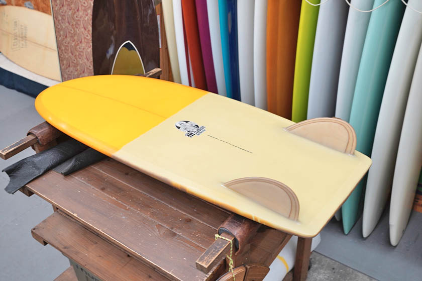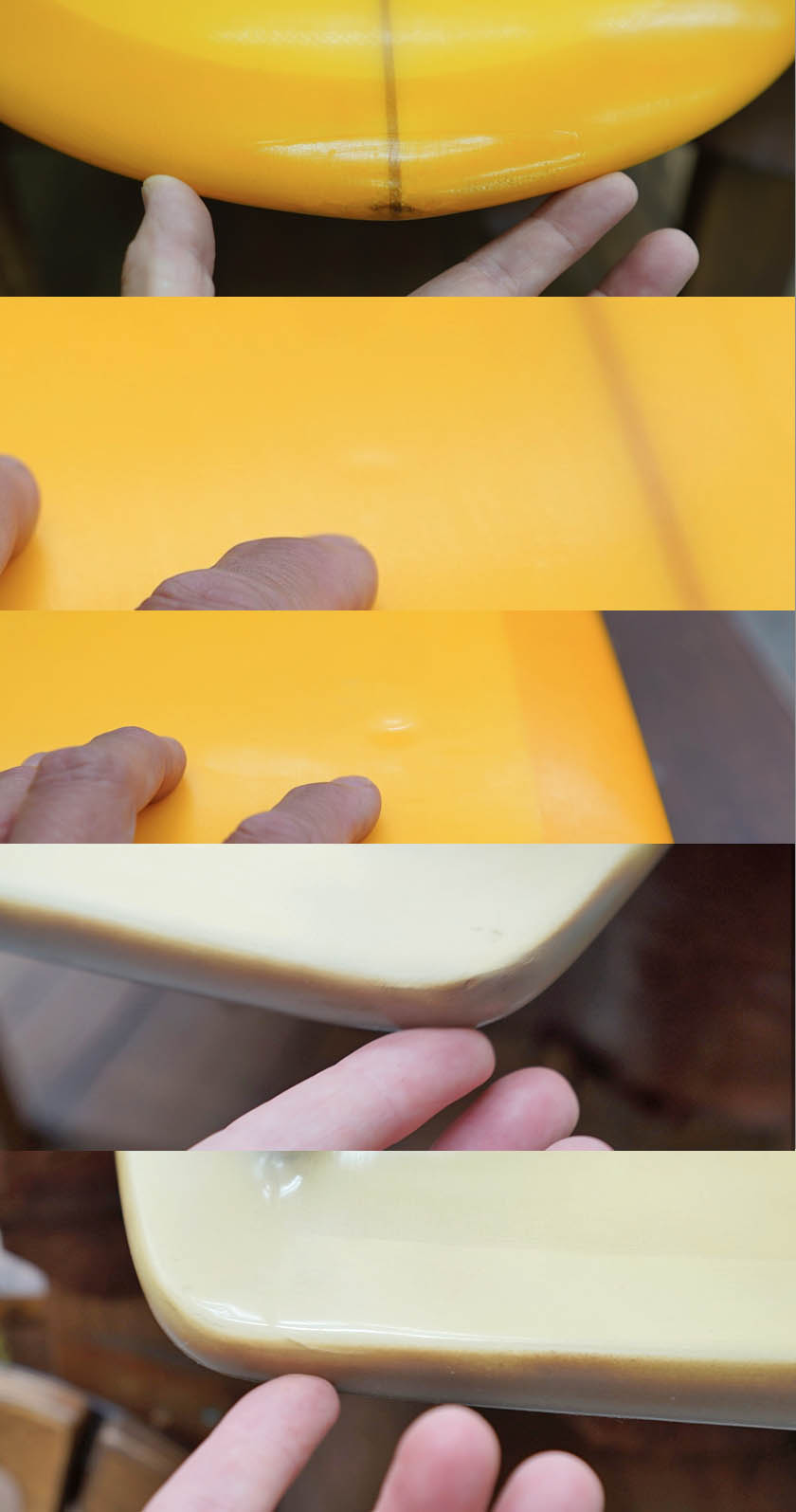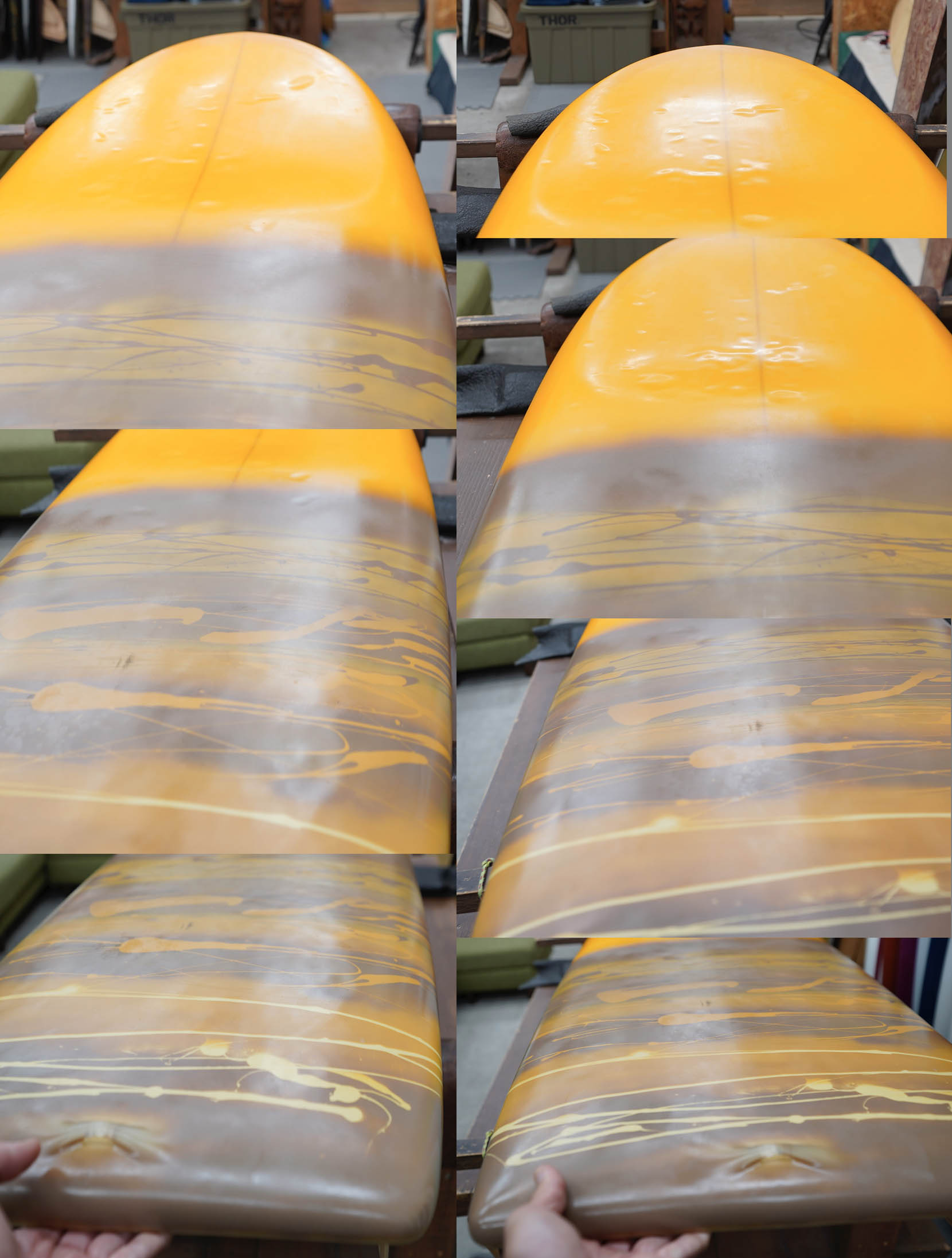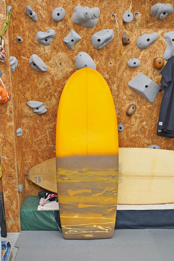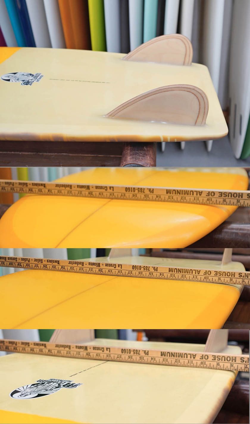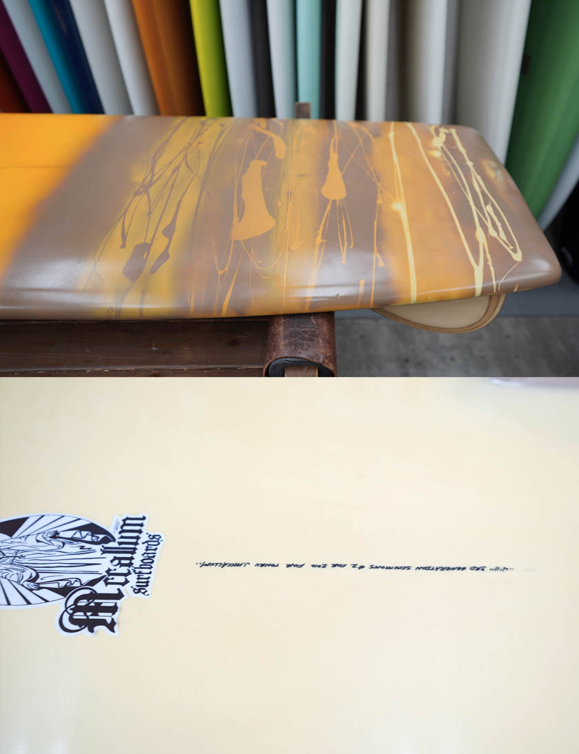 ニュー・エボリューションのユーズド・サーフボードは、ショートレングスからロングボードまで、個性豊かで充実したラインナップ。出来る限り分かりやすいコンディションの説明で、開業より20年以上日本各地の多くの皆様に販売を続けております。 あくまでもユーズドなので、コンディションについて気になる点がある場合は、お気軽にメールにてお問い合わせください。 尚、出来るだけお求めやすい金額でご提案させていただけるよう、ユーズドボードにつきましては現金特価とさせていただいております。カード決済ご希望の場合は、ご相談ください。 McCallum 3rd Generation Simmons 4'11" * 22" * 2&11/16" Wetsand & gloss, collagen yellow & beige both side, self painted art deck, glass leash loop, glass on wood twin fin. ユーズド、マッカラムの4’11”サード・ジェネレーション・シモンズです。本数限定で生産されたリミテッド板のミニシモンズ。こちらは第三弾としてファースト・ゲネレーション・モデルをカスタムオーダーした一本。年数の割にまあ使用回数自体が少なく、画像程度のフットマーク、ボトムに極浅い小さな凹み数個とテールエンドの日々が見受けられる程度のコンディションでしょう。デッキのテールよりは売主様がセルフでアートを施して飾っていたそうです。(使用回数自体が少ないもので、フットマーク自体が少なく剥離などのリペアーではありません。)気になる方がアセトンやリムーバーなどで綺麗に落とせるかと思います。