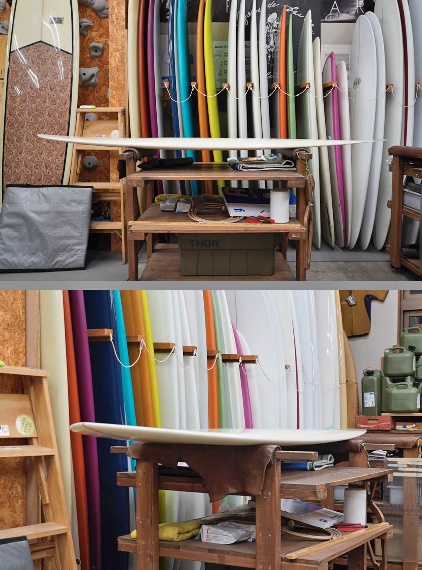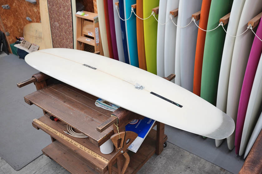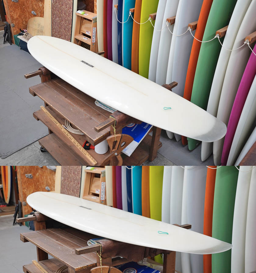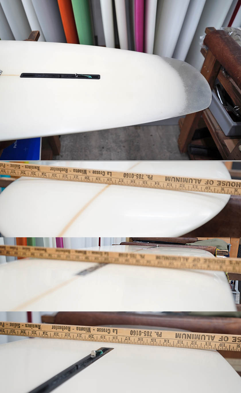 ユーズド、マッカラムの7’4”フレックステール・ハルです。まだ全ての工程をジェフ・マッカラム自身で行っていた時代に、弊店向けに2本だけ作ってくれたとても珍しいフレックス・テールを持つディスプレイスメント・ハルです。乗りやすいシェイプではないですが、旧教のスピードを味わえるマニア向けの一本でしょう。コンディションはデッキ位には画像のようなフットマーク、レール周りに白くなった内部のアタリがある程度、ボトムに小さなものも含め凹みがある程度、またフレックス部分のレールサイドには、リペアーはしておりますが、シナリによるヒビが見受けられます。フィンの付属はありません。