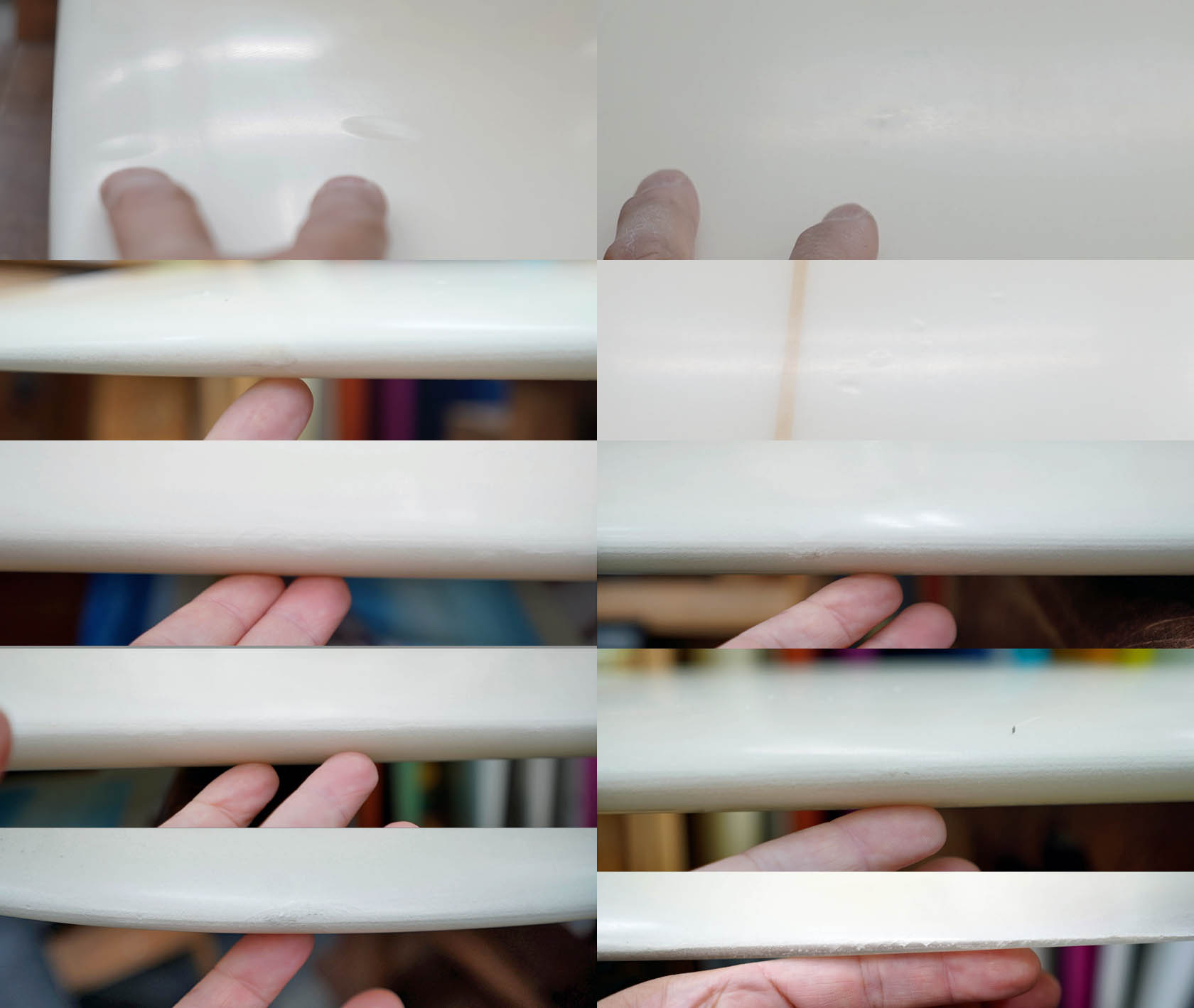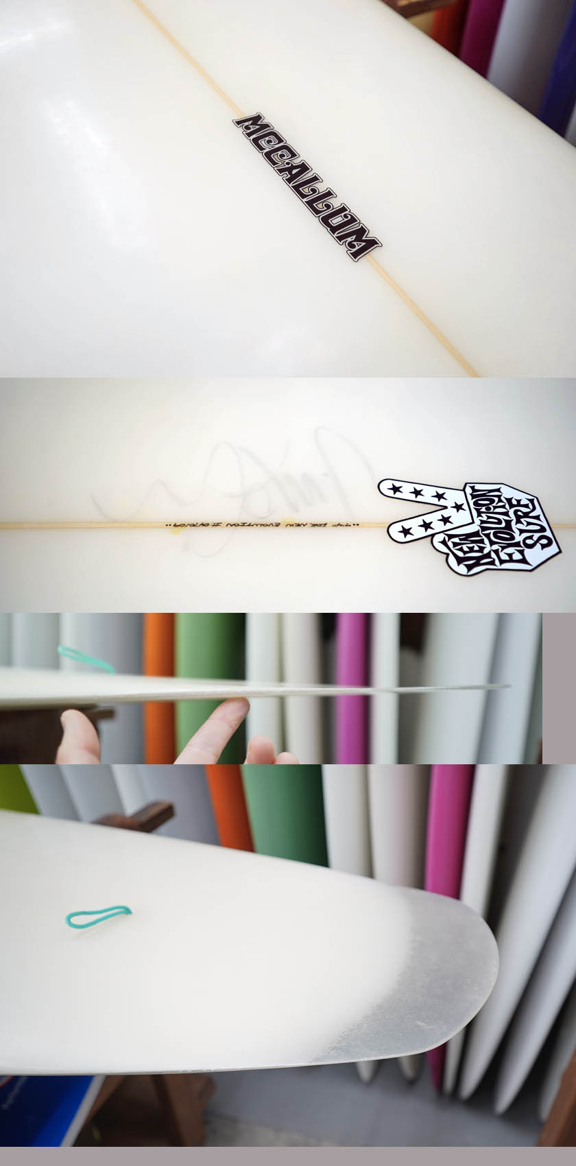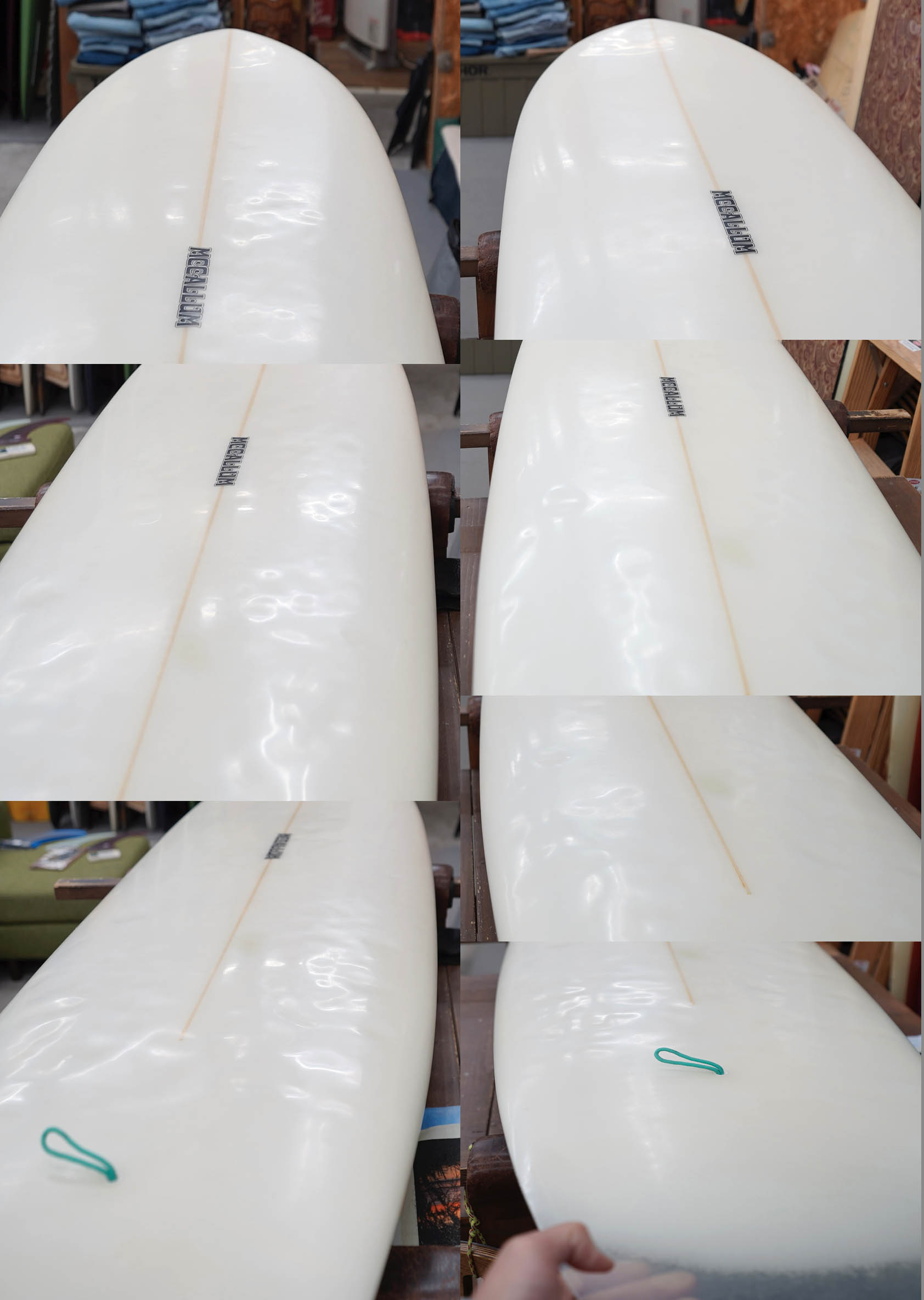 ユーズド、マッカラムの7’4”フレックステール・ハルです。まだ全ての工程をジェフ・マッカラム自身で行っていた時代に、弊店向けに2本だけ作ってくれたとても珍しいフレックス・テールを持つディスプレイスメント・ハルです。乗りやすいシェイプではないですが、旧教のスピードを味わえるマニア向けの一本でしょう。コンディションはデッキ位には画像のようなフットマーク、レール周りに白くなった内部のアタリがある程度、ボトムに小さなものも含め凹みがある程度、またフレックス部分のレールサイドには、リペアーはしておりますが、シナリによるヒビが見受けられます。フィンの付属はありません。