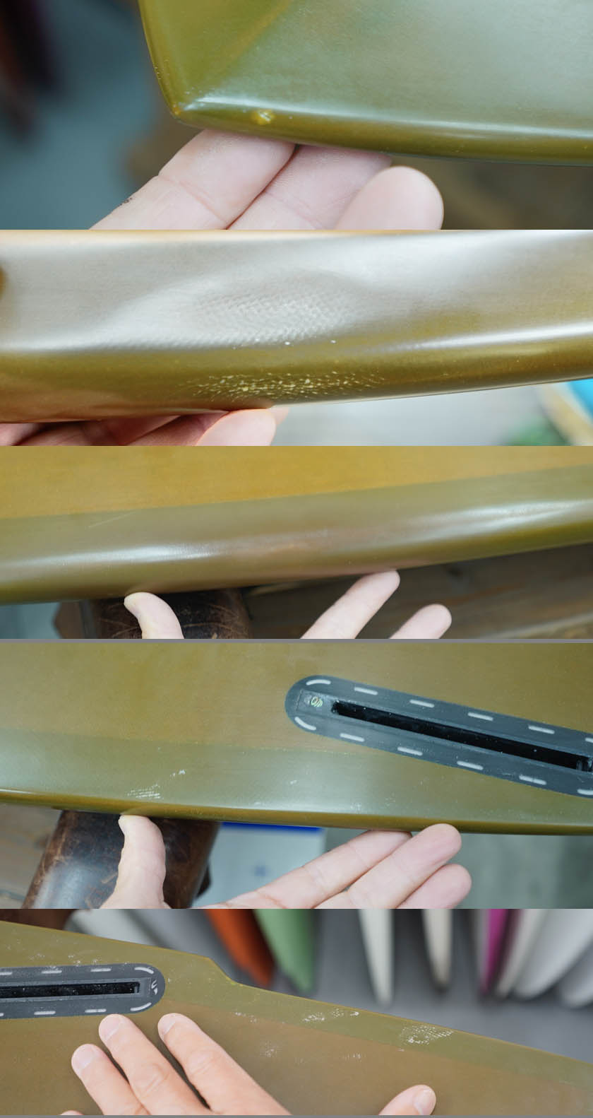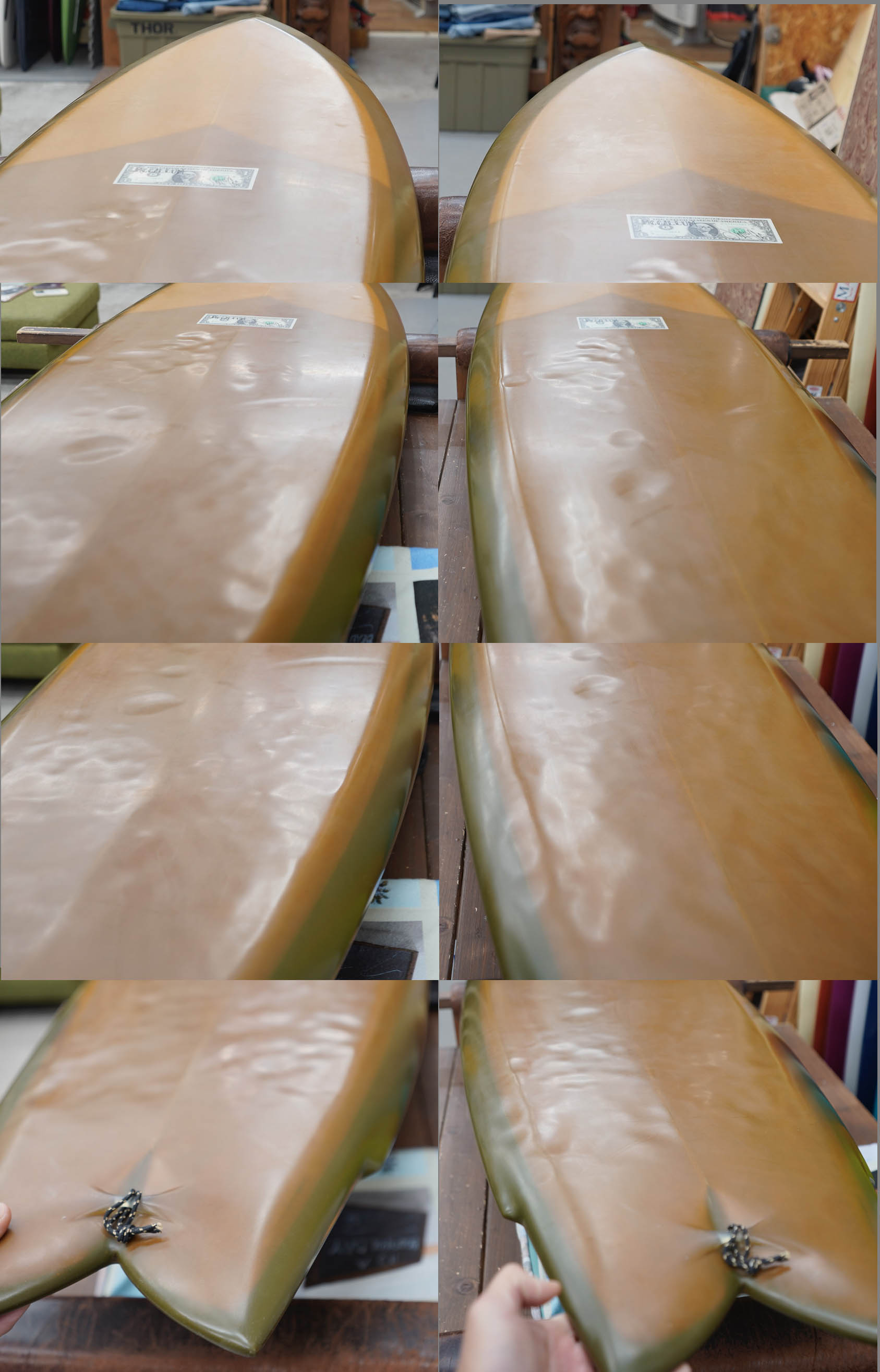 ユーズド、マッカラムの6’4”JM フィッシュです。細身でウィングいるのパフォーマンス性を高めたデザインなので、ホローなビーチからリーフ、またアイランドトリップにもマルチに活躍してくれそうなマッカラムの一本。デッキには画像のようなフットマークとストリンガー沿いに使用してできるヒビ、ノーズに小さな白い点のディング、レールにリペアー歴とデッキ側の凹みを伴うダメージ(ヒビのリペアーを推奨)、そのほかフィンプラグ周りには使用に一歳影響のないラミネート時の内部のムラが見受けられるコンディションでしょう。フィンセットの付属はありません。