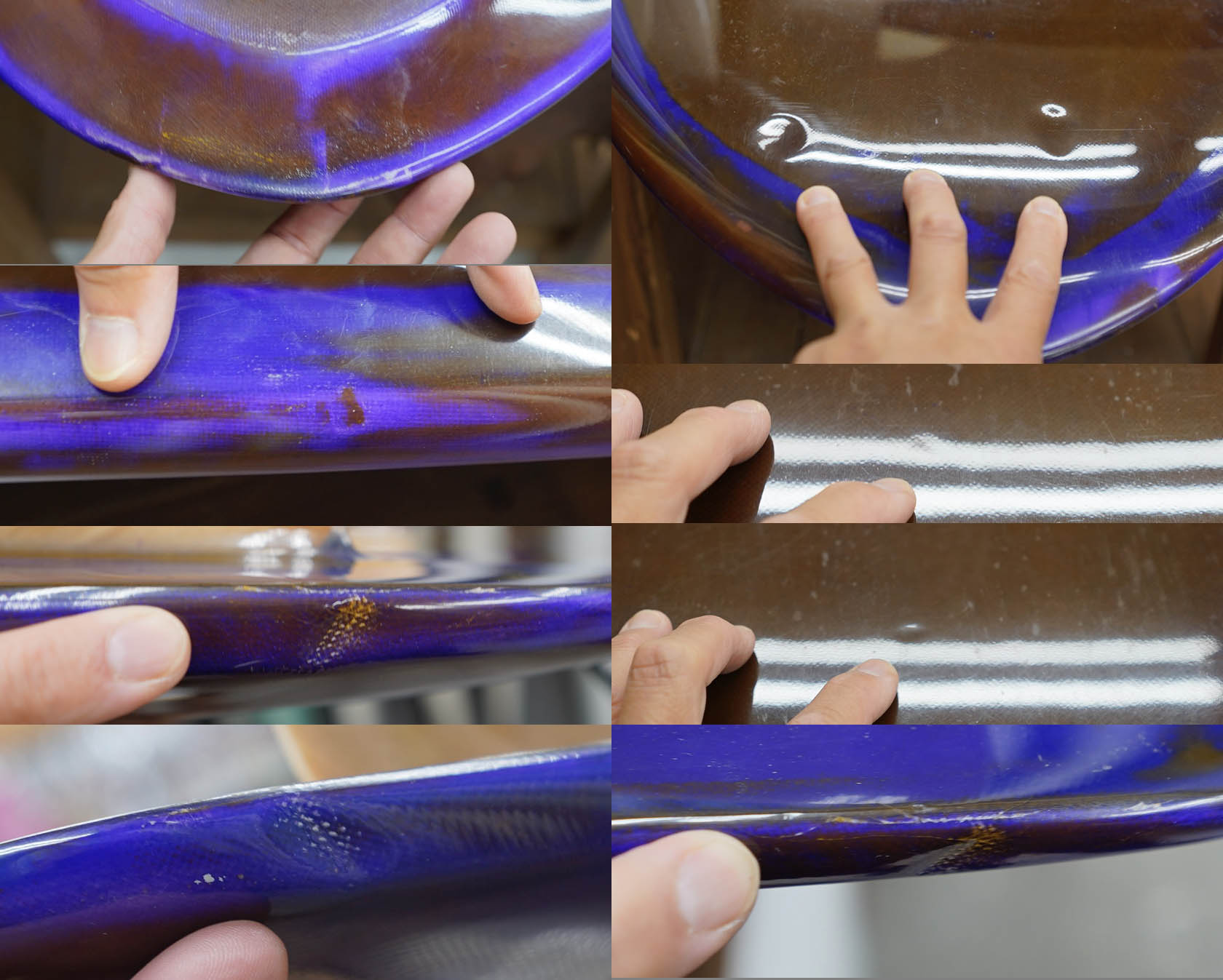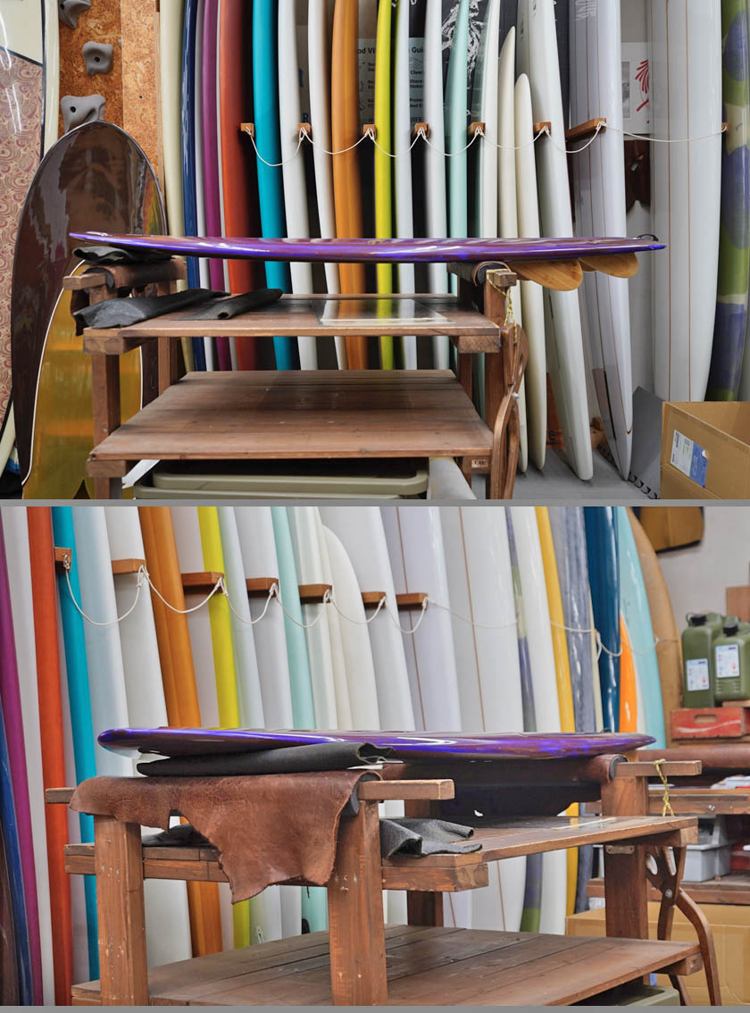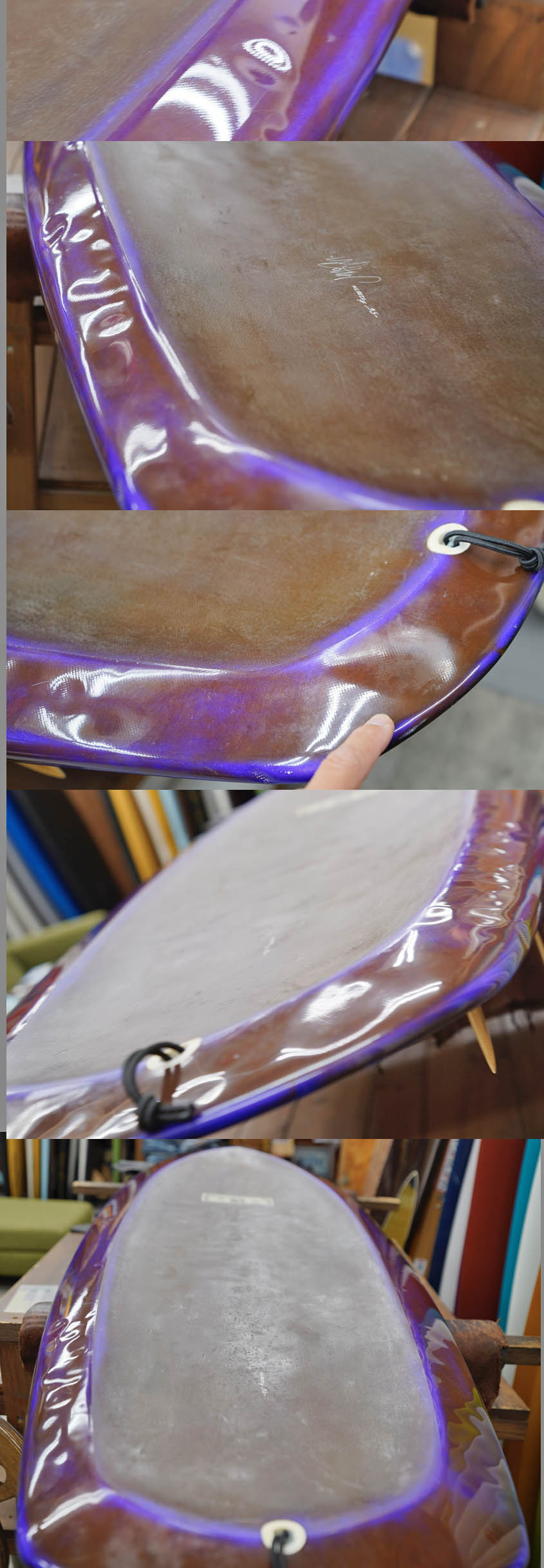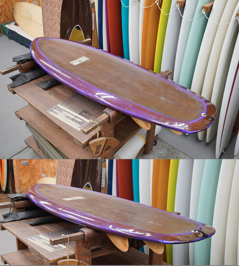 ニュー・エボリューションのユーズド・サーフボードは、ショートレングスからロングボードまで、個性豊かで充実したラインナップ。出来る限り分かりやすいコンディションの説明で、開業より20年以上日本各地の多くの皆様に販売を続けております。 あくまでもユーズドなので、コンディションについて気になる点がある場合は、お気軽にメールにてお問い合わせください。 尚、出来るだけお求めやすい金額でご提案させていただけるよう、ユーズドボードにつきましては現金特価とさせていただいております。カード決済ご希望の場合は、ご相談ください。 McCallum M Ford 5'6" * 22&1/4" * 1&7/16"(2&1/2") Stringerless, extured adrk magenta base colored hotcoat deck, polished violet base colored hotcoat bottom, leash cup, glass on 101 bamboo quad keel fin. ユーズド、マッカラムの5’6”Mフォードです。スプーン・インスパイヤードのとてもユニークな一本で、ストリンガーレス、大胆なスクープデッキ、テクスチャード・デッキ、シモンズフィンのクワッドがグラスオンと個性溢れる仕様となっております。乗り味もとてもソフトで独特な通常のシェイプとは異次元なものなので、個性的なボードを探している方には面白いかもしれませんね。フットマーク自体はテクスチャーとコンケーブではっきりわからない状態ですが、全体に面の歪みがある程度でしょう。そのほかレール周りの凹みやレールノリペアー歴、ボトムの凹みなども画像で見受けられる程度だと思います。