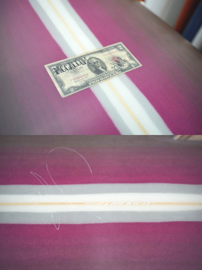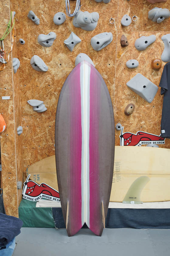 ユーズド・カテゴリーですが、全くの新品未使用、マッカラムの5’3”ジプシー・フィッシュです。カラーリングから細部までセンスあるこだわりでカスタムオーダーした一本で、なんとマークも古い2ドル札仕様。落ち着いたワインレッド系のストライプ・アブストラクトの一本ですね。購入時の価格から考えるとグッとお得な設定になっております。