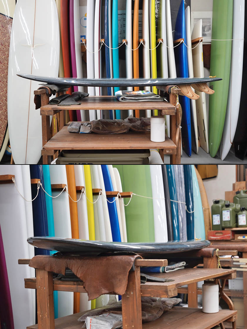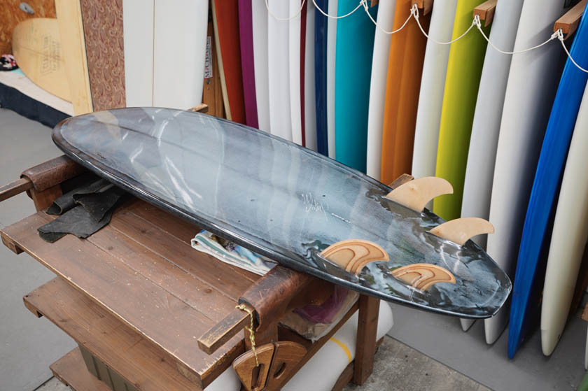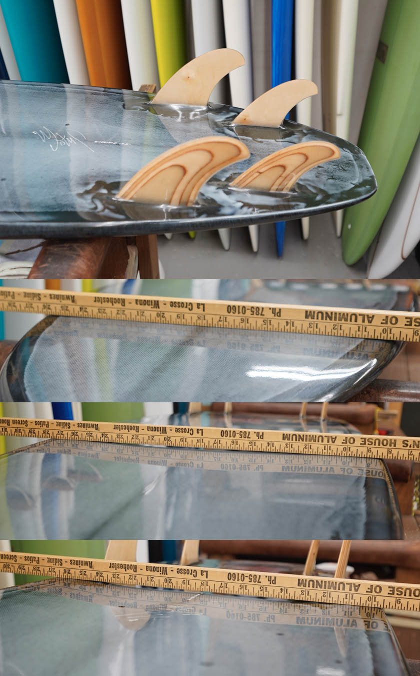 black wood stringer, glass leash loop, glass on wood quad fin.
