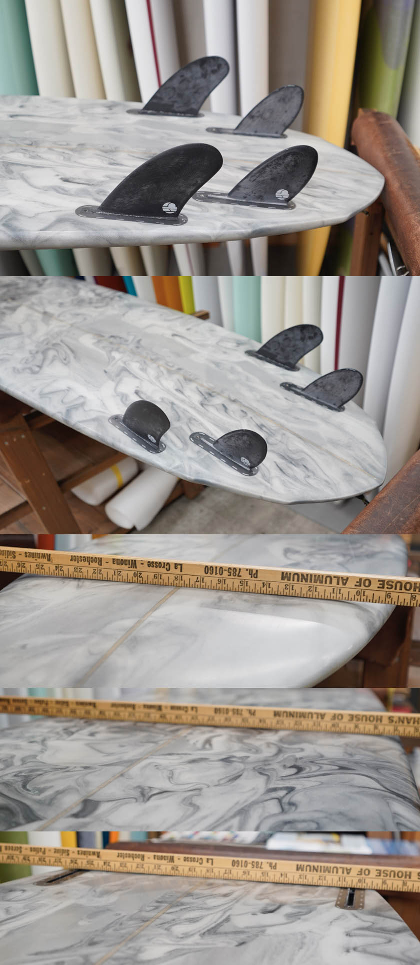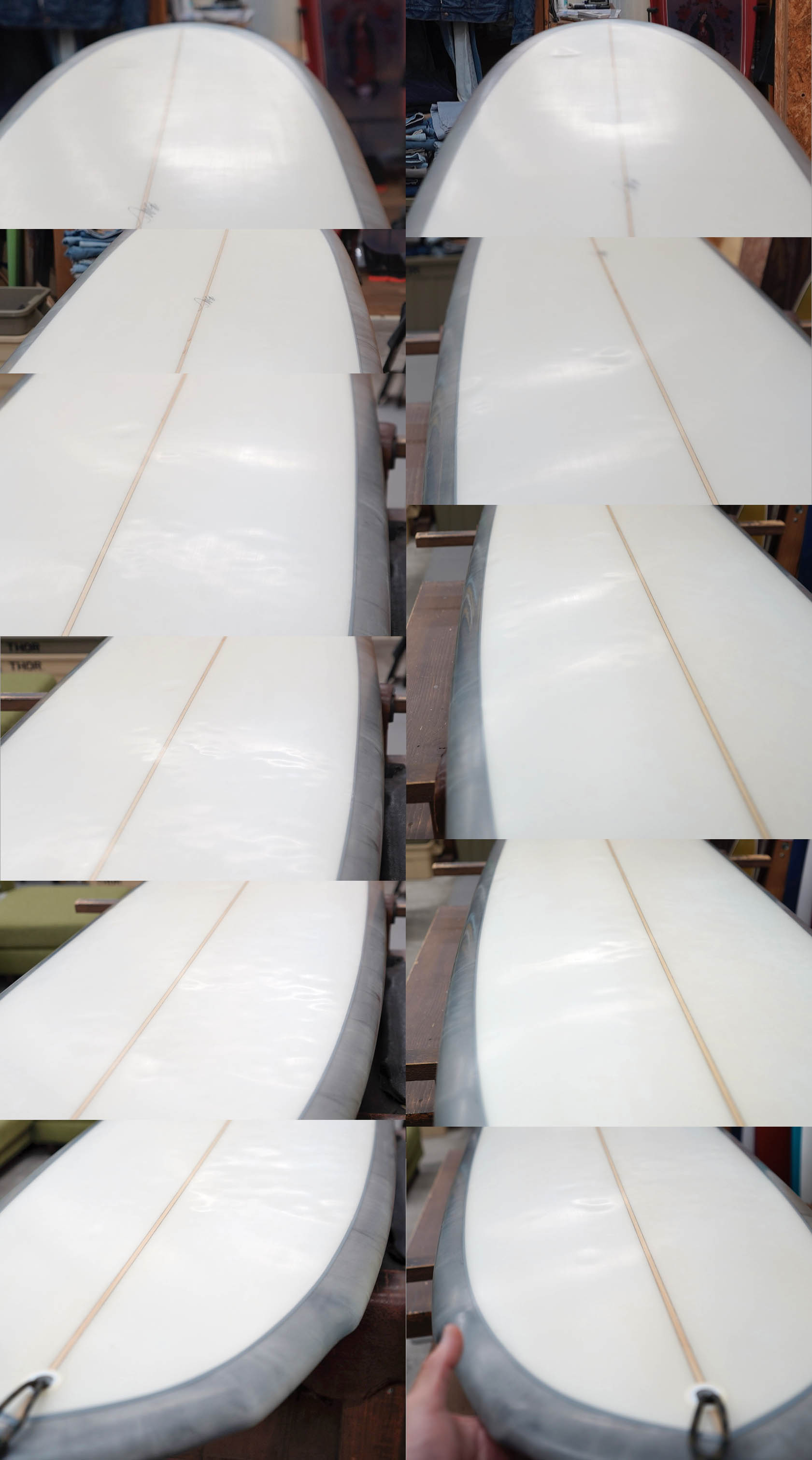 ユーズド、ミツベンの9’0”ダブル・ウィング・ラウンドテール・シモンズです。匠ボブのミニシモンズのバリエーションの一つで、より回転製を意識したクワッドになります。ロングボードサイズでも異次元のスピードとマニューバーが楽しめる他にないデザインが魅力的な一本でしょう。デッキには画像程度のフットマーク、ボトムに凹みがいくつか(うち一つは爪がかかるかもしれません)表面上のスクラッチなどが見受けられるコンディションでしょう。限定背生産したミツベンのクワッドフィンが付属いたします。