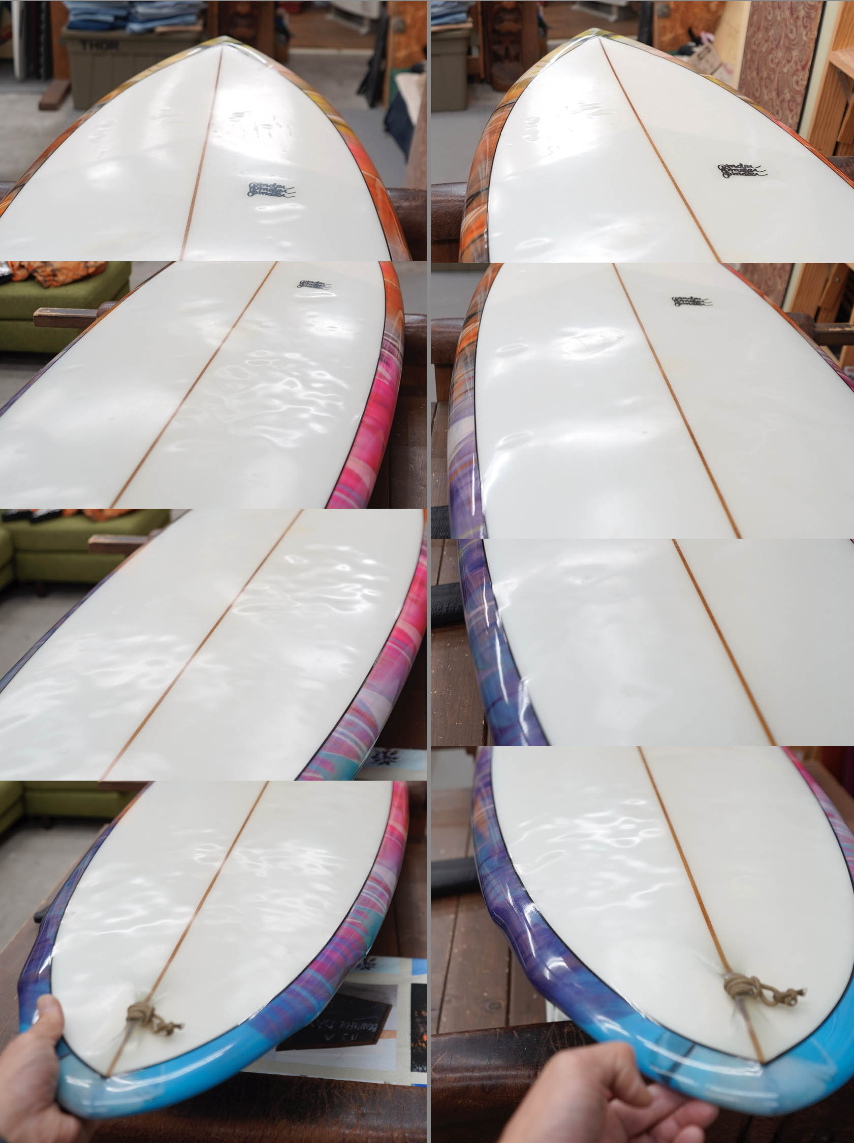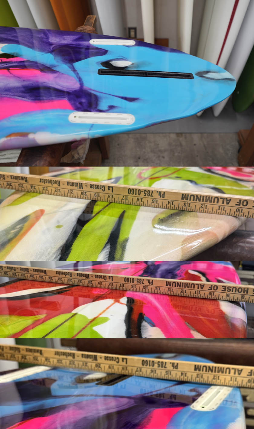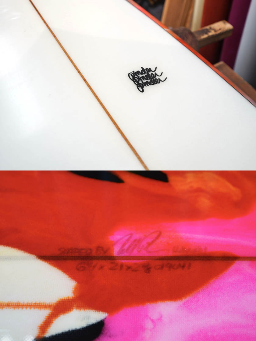 ニュー・エボリューションのユーズド・サーフボードは、ショートレングスからロングボードまで、個性豊かで充実したラインナップ。出来る限り分かりやすいコンディションの説明で、開業より20年以上日本各地の多くの皆様に販売を続けております。 あくまでもユーズドなので、コンディションについて気になる点がある場合は、お気軽にメールにてお問い合わせください。 尚、出来るだけお求めやすい金額でご提案させていただけるよう、ユーズドボードにつきましては現金特価とさせていただいております。カード決済ご希望の場合は、ご相談ください。 Pinder Wing Pin 6'4” * 21" * 2&7/8" GLoss & polish, cedar stringer, clear deck, abstract rails & bottom, deck patch, glass leash loop, future side bite plug, center box. (fin set not included.) ユーズド、ピンダーの6’4”ウィング・ピンです。ソフトなダブル・ウィングが入ったシングルフィン・スタビライザーのカスタムオーダー品です。素直な乗り味が楽しめそうな一本ですね。デッキには画像程度のフットマーク、テールよりのレールにアタリ(リペアー済みのようです)、ボトムに凹みが画像程度見受けられるコンディションでしょう。デッキの凹みの大きかったところ2、三箇所はリペアーしてフラットにしてあります。フィンセットの付属はありません。