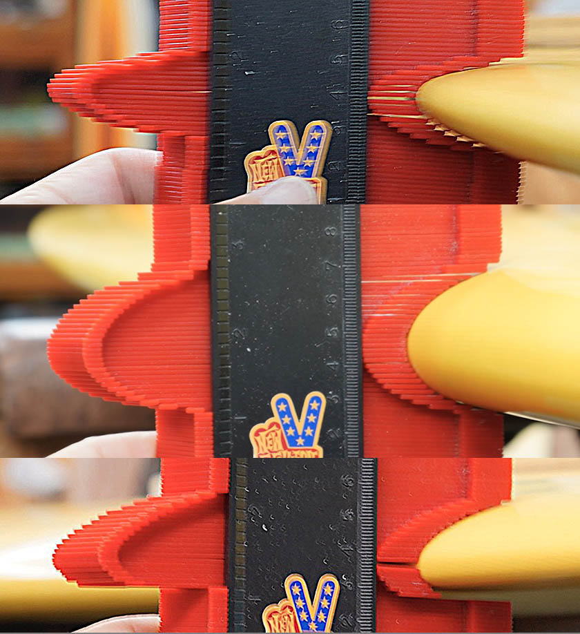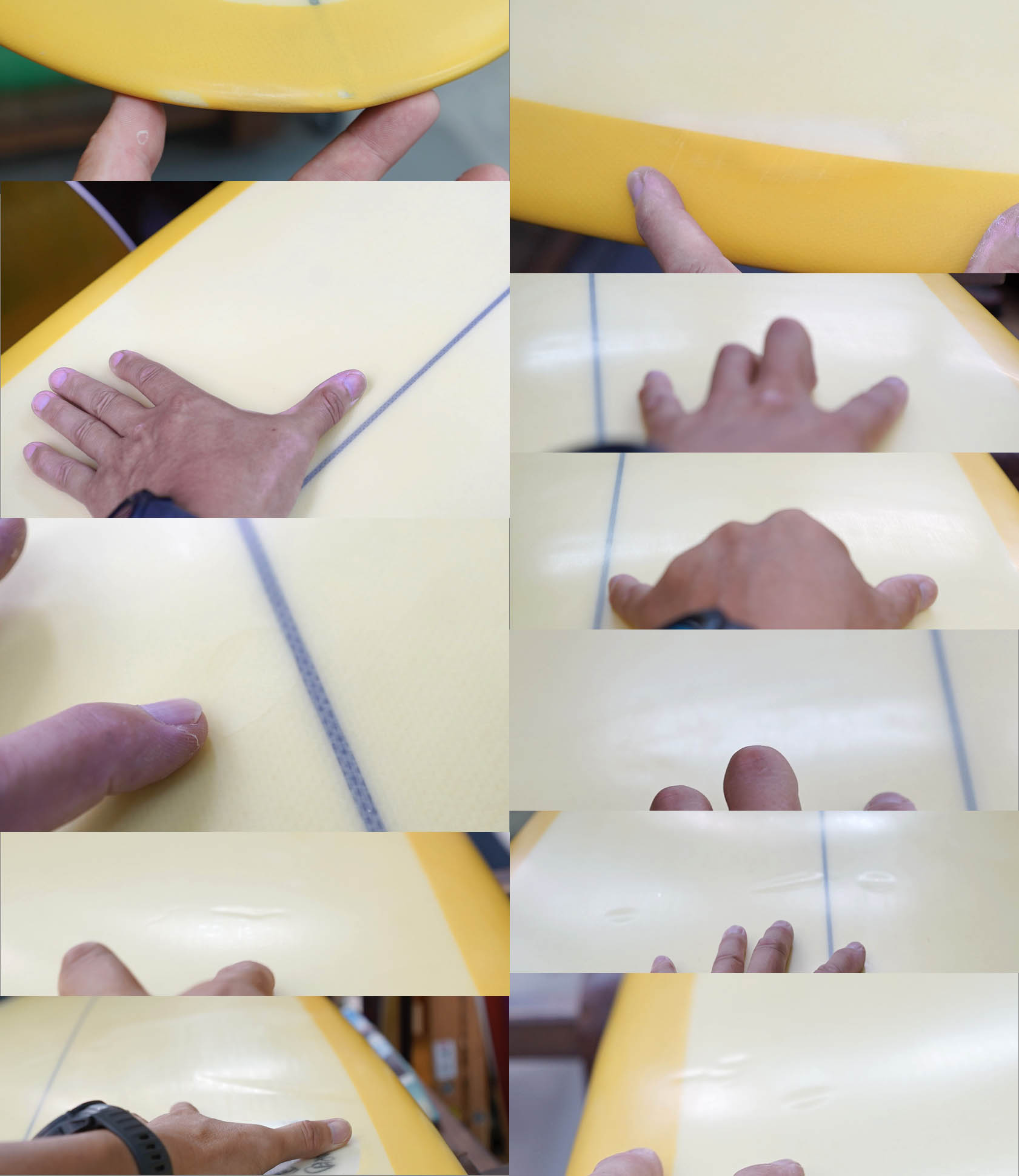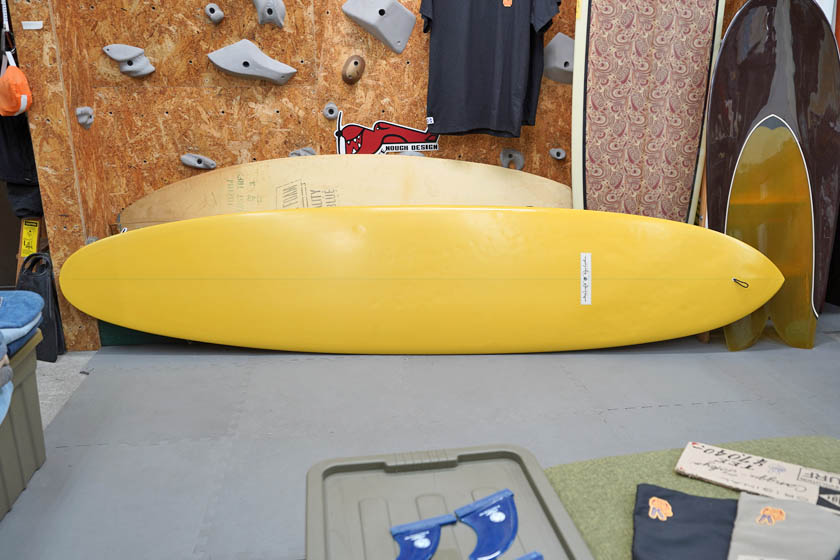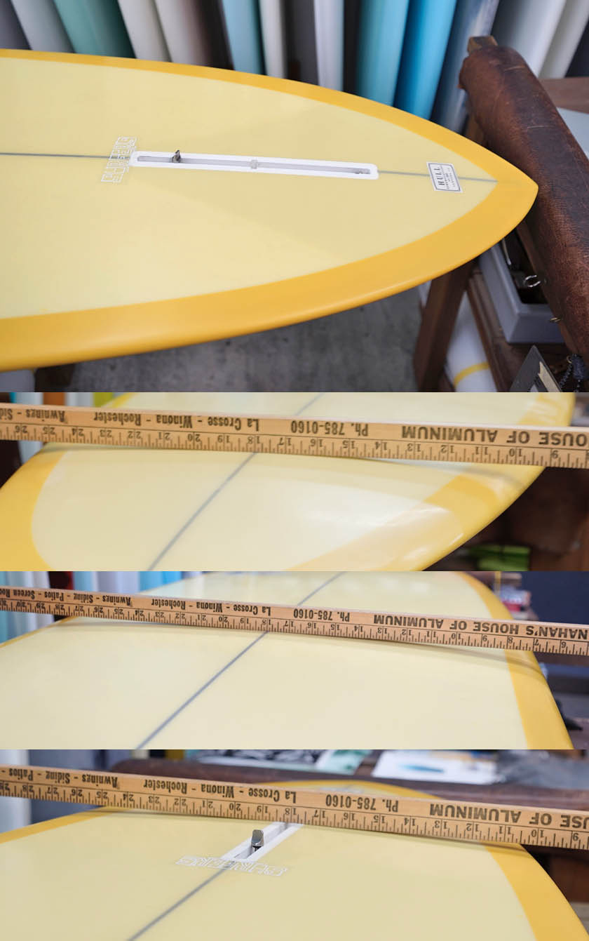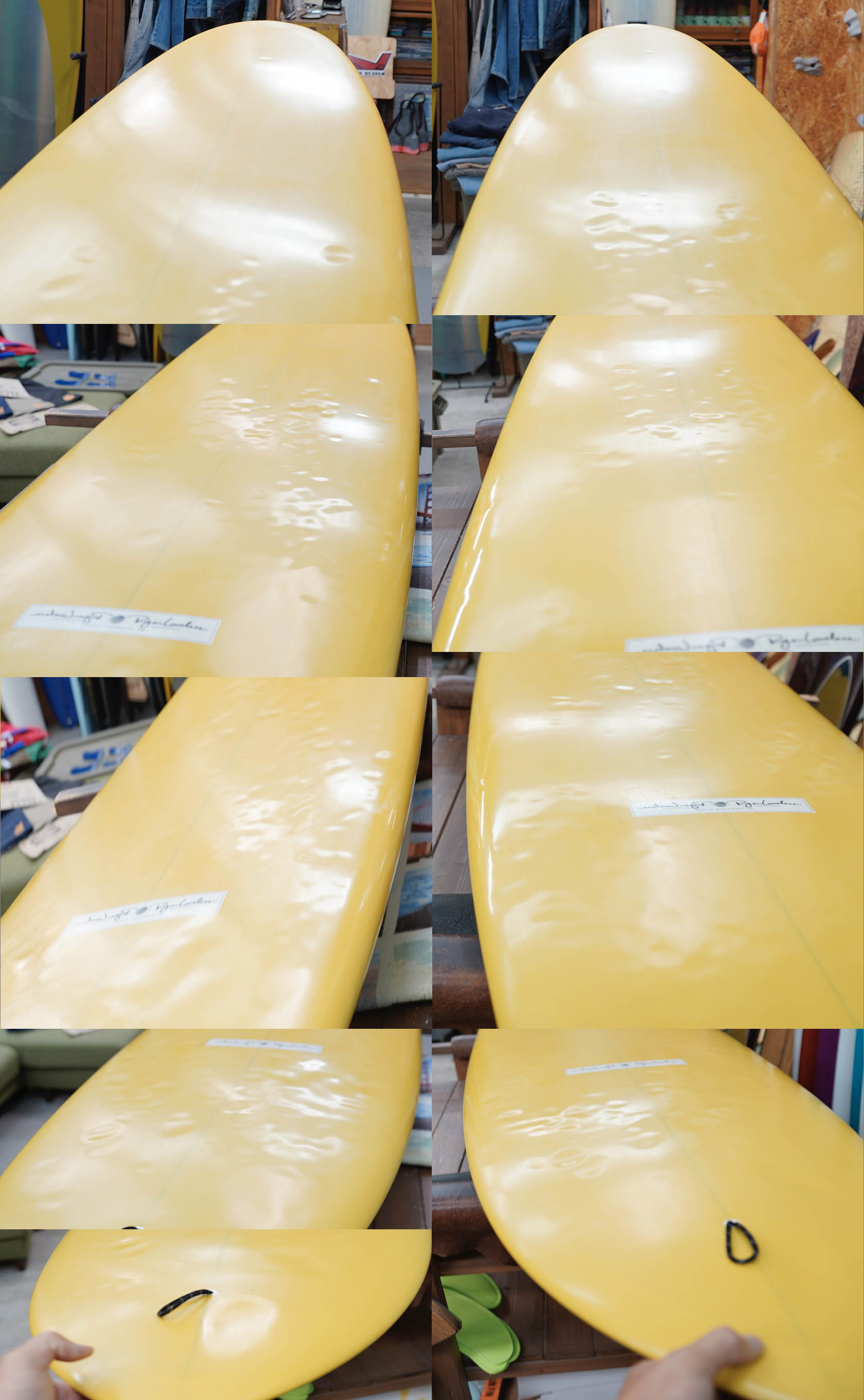 ニュー・エボリューションのユーズド・サーフボードは、ショートレングスからロングボードまで、個性豊かで充実したラインナップ。出来る限り分かりやすいコンディションの説明で、開業より20年以上日本各地の多くの皆様に販売を続けております。 あくまでもユーズドなので、コンディションについて気になる点がある場合は、お気軽にメールにてお問い合わせください。 尚、出来るだけお求めやすい金額でご提案させていただけるよう、ユーズドボードにつきましては現金特価とさせていただいております。カード決済ご希望の場合は、ご相談ください。 Ryan Lovelace V Bowls 9'2" * 23" * 3&1/8" Wetsand & gloss, yellow opaque deck wrapping rails, light yellow half opsque bottom,leash hole, single box. (center fin not included) ユーズド、ライアン・ラブレースの9’2”Vボウルズです。人気のあるハル系でもテールコントロールできるタイプのシェイプですが、現在ではこのサイズのVボウルズはオーダーできないそうですので、とても貴重な一本のようです。コンディションは、デッキには画像のようなフットマーク、ボトムに凹みが画像程度、またノーズとノーズよりのボトム他リペアー歴が数箇所見受けられるコンディションでしょう。凹みのうちヒビを伴いものが1、2個ある感じです。センターフィンの付属はありません。