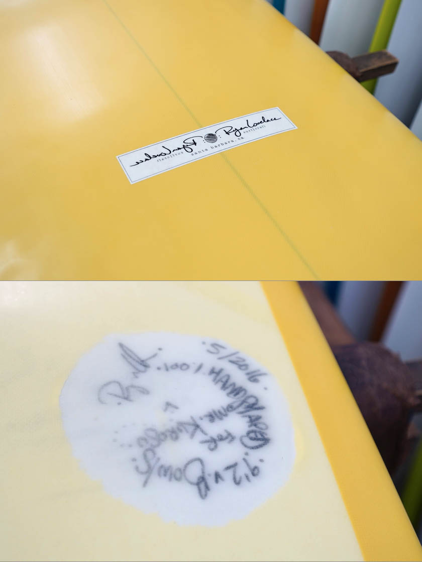ユーズド、ライアン・ラブレースの9’2”Vボウルズです。人気のあるハル系でもテールコントロールできるタイプのシェイプですが、現在ではこのサイズのVボウルズはオーダーできないそうですので、とても貴重な一本のようです。コンディションは、デッキには画像のようなフットマーク、ボトムに凹みが画像程度、またノーズとノーズよりのボトム他リペアー歴が数箇所見受けられるコンディションでしょう。凹みのうちヒビを伴いものが1、2個ある感じです。センターフィンの付属はありません。