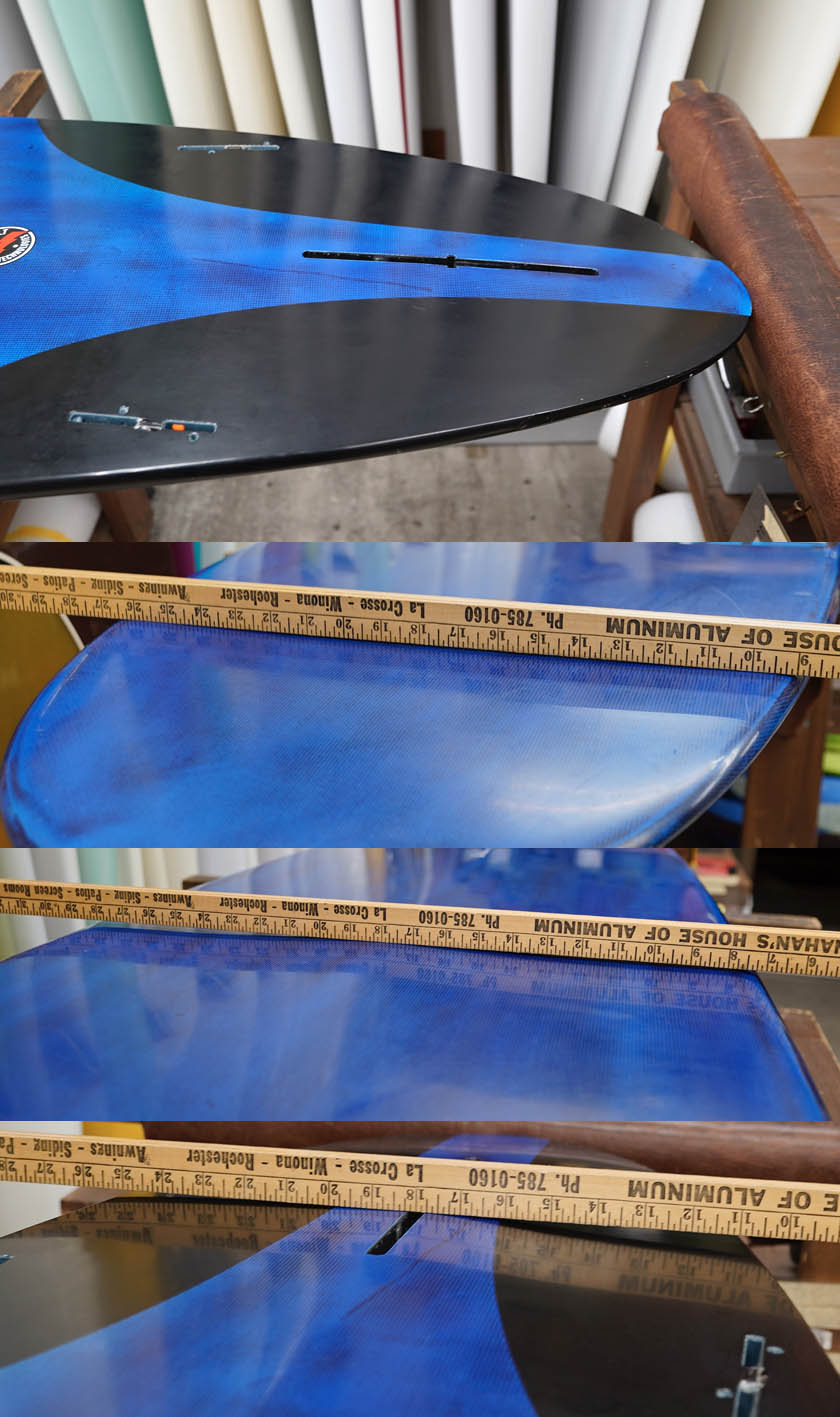 ニュー・エボリューションのユーズド・サーフボードは、ショートレングスからロングボードまで、個性豊かで充実したラインナップ。出来る限り分かりやすいコンディションの説明で、開業より20年以上日本各地の多くの皆様に販売を続けております。 あくまでもユーズドなので、コンディションについて気になる点がある場合は、お気軽にメールにてお問い合わせください。 尚、出来るだけお求めやすい金額でご提案させていただけるよう、ユーズドボードにつきましては現金特価とさせていただいております。カード決済ご希望の場合は、ご相談ください。 Thunderbolt Skin Dog Blender 9'1" * 22&1/4" * 2&7/8" Thunderbolt technorogy, multi color, leash cup, side fcsII plug, center box. (fin set not included) ユーズド、スキンドッグの9’1”ブレンダーです。サンダーボルト・テクノロジーの軽量で丈夫な一本。フットマークは画像程度、レールの小さなアタリにクリヤーテープ取り付け、その他小さな塗装の剥がれいくつかのボトムの極浅い凹みなど、ある程度使用感はあるボードですが、いずれも使用に問題のあるものではないでしょう。フィンセットの付属はありません。