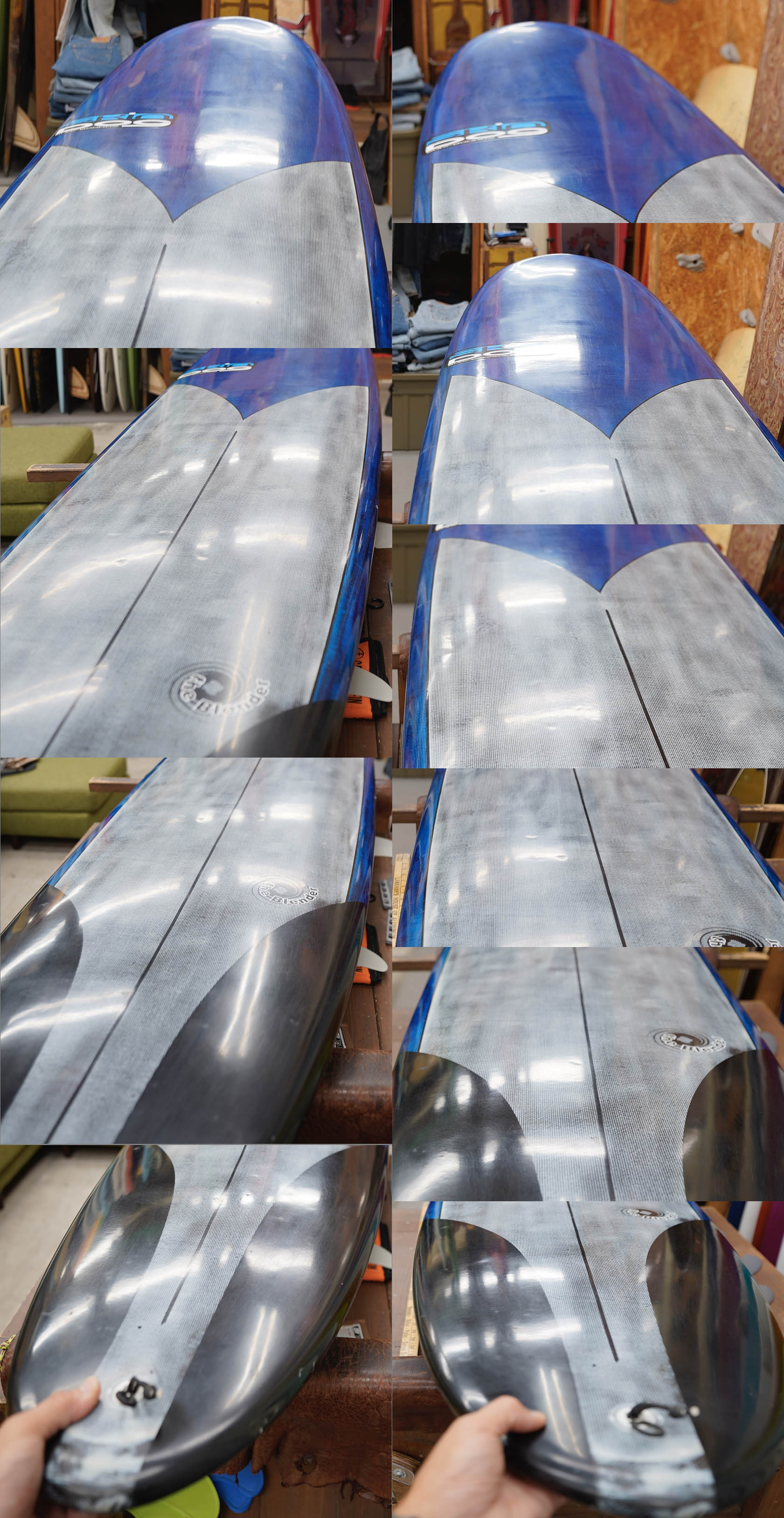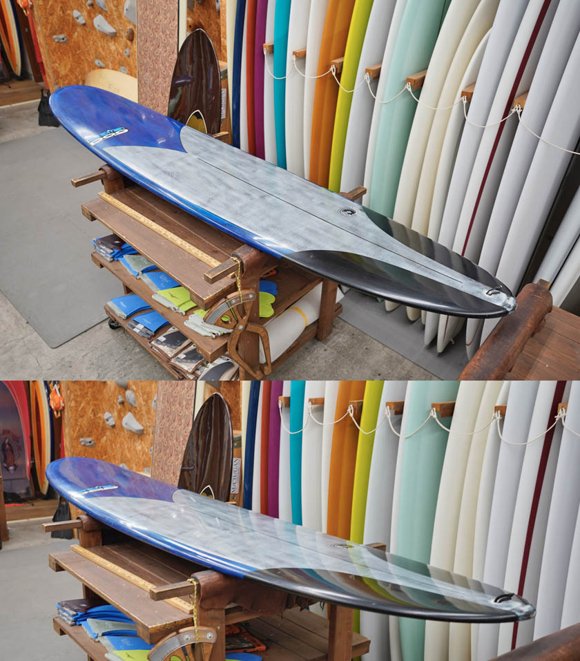 ユーズド、スキンドッグの9’1”ブレンダーです。サンダーボルト・テクノロジーの軽量で丈夫な一本。フットマークは画像程度、レールの小さなアタリにクリヤーテープ取り付け、その他小さな塗装の剥がれいくつかのボトムの極浅い凹みなど、ある程度使用感はあるボードですが、いずれも使用に問題のあるものではないでしょう。フィンセットの付属はありません。