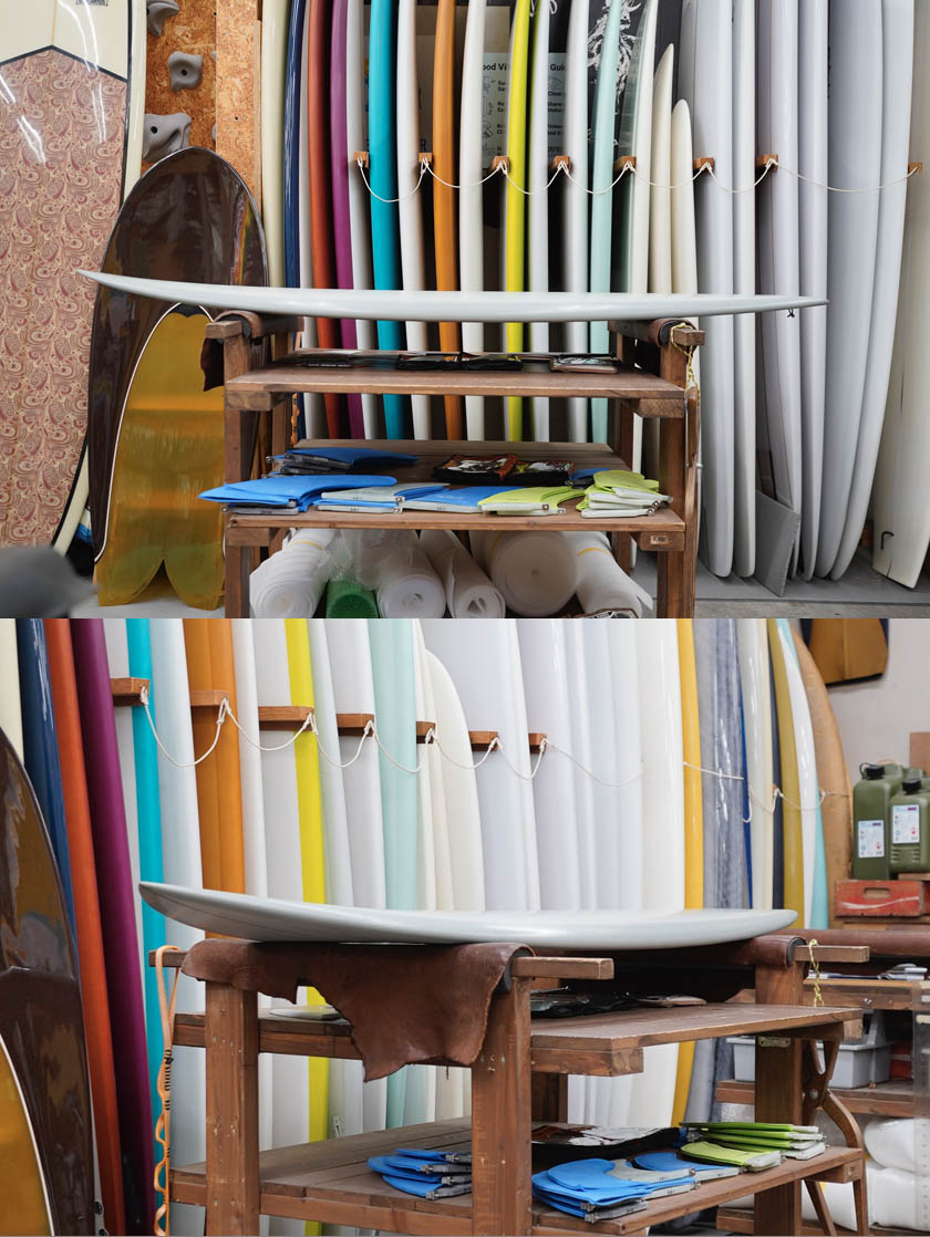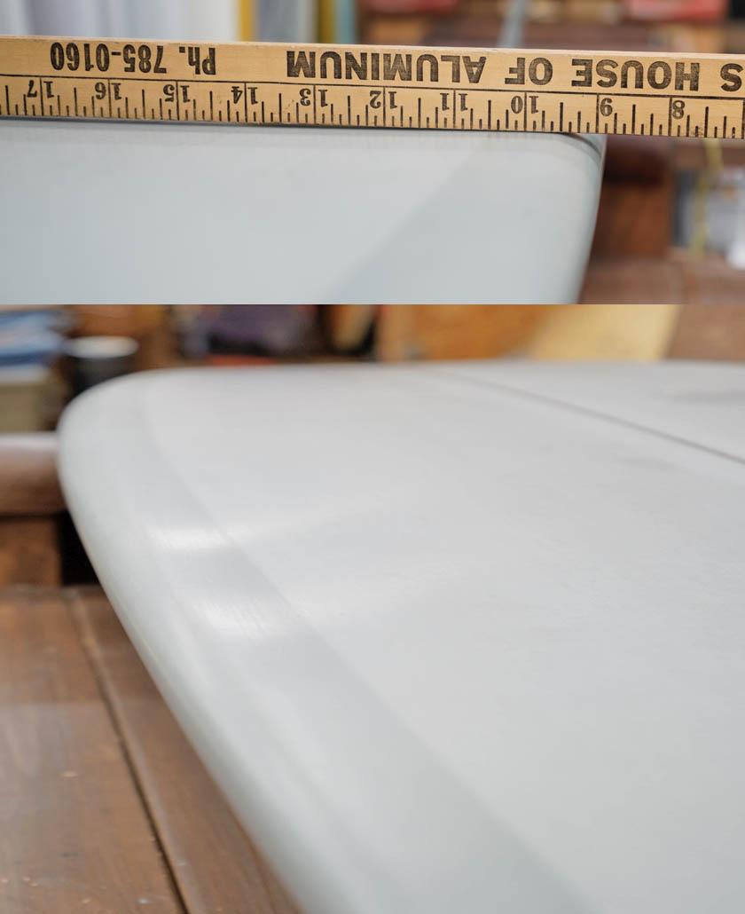 dark wood stringer, fin patch, glass leash loop, future twin plug.