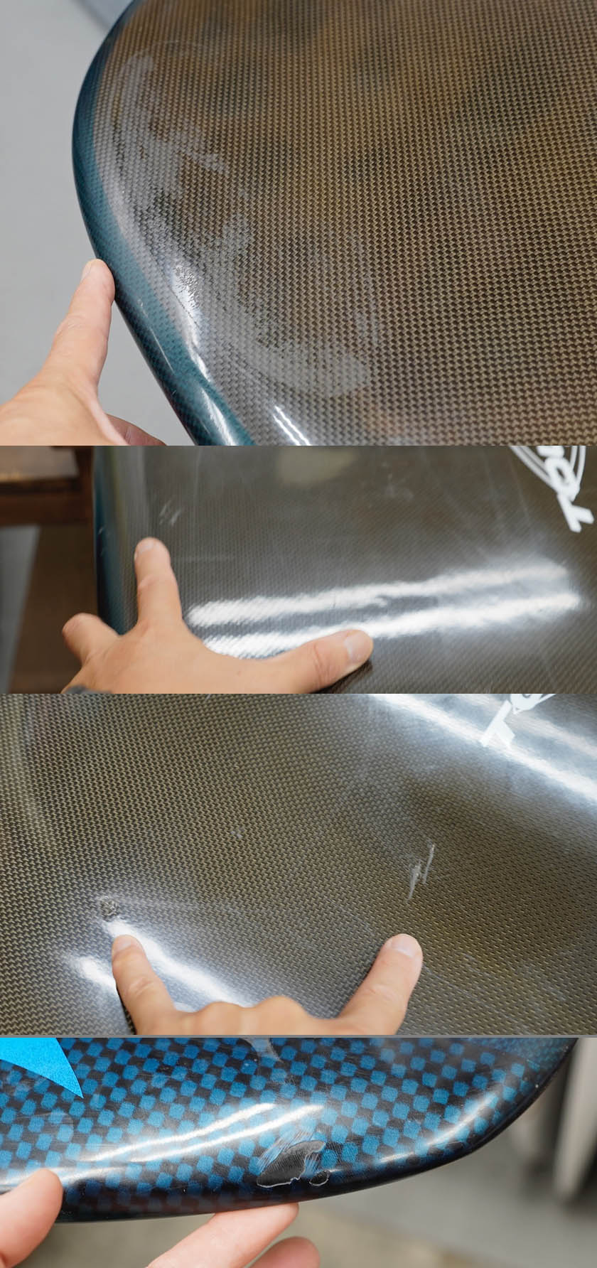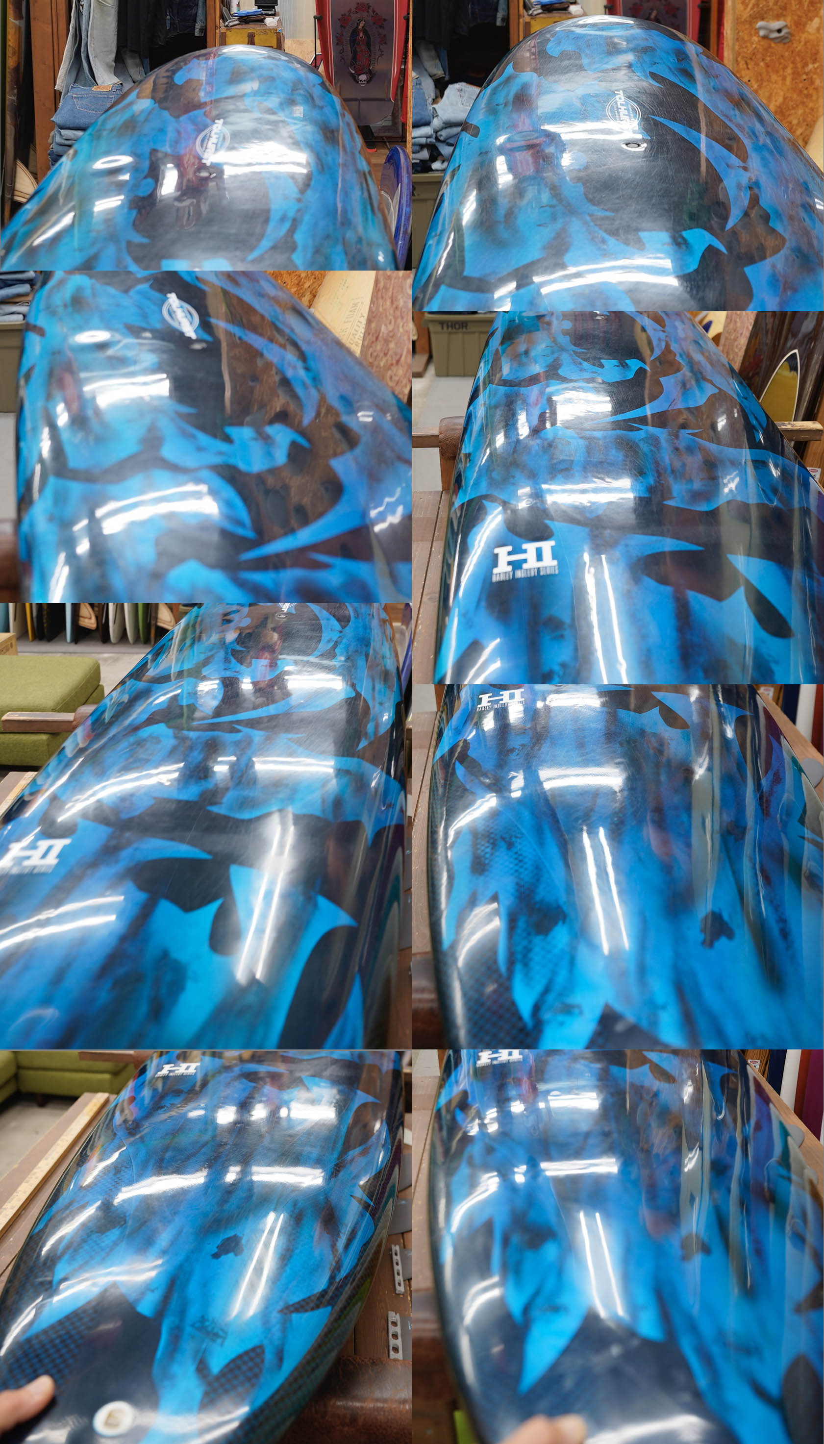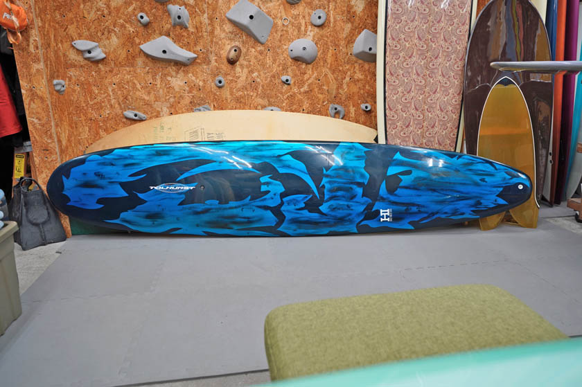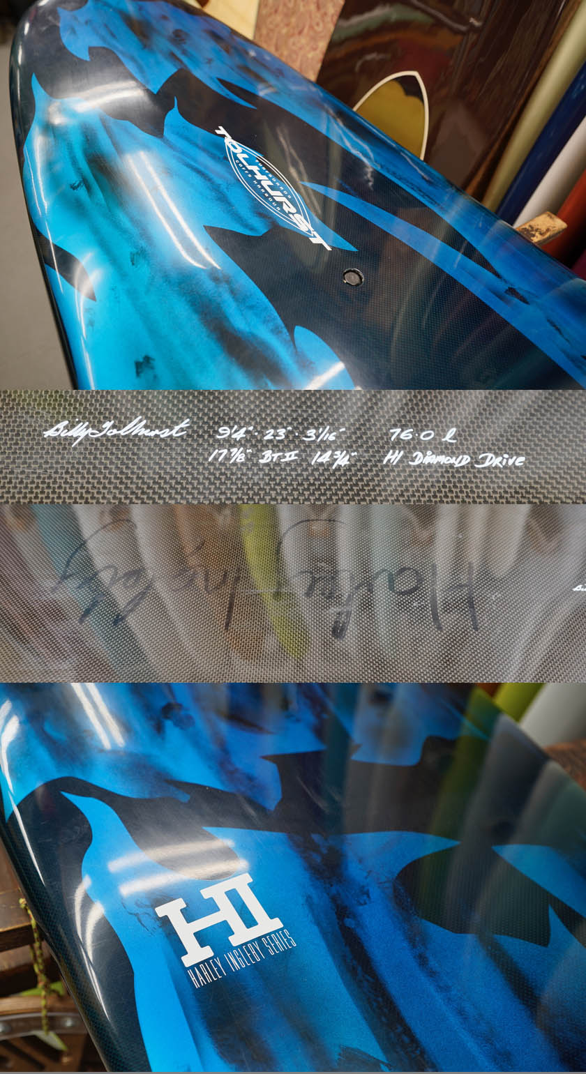 ニュー・エボリューションのユーズド・サーフボードは、ショートレングスからロングボードまで、個性豊かで充実したラインナップ。出来る限り分かりやすいコンディションの説明で、開業より20年以上日本各地の多くの皆様に販売を続けております。 あくまでもユーズドなので、コンディションについて気になる点がある場合は、お気軽にメールにてお問い合わせください。 尚、出来るだけお求めやすい金額でご提案させていただけるよう、ユーズドボードにつきましては現金特価とさせていただいております。カード決済ご希望の場合は、ご相談ください。 Tolhurst HI Diamond Drive 9'4" * 23" * 3&1/16" Thunderbolt technology, tail flex, leash cup,side fcs II plug, center box. (fin set not included) ユーズド、トゥルハーストの9’4”ダイヤモンド・ドライブです。サンダーボルト製のジオン・カーボン仕様で軽量で丈夫な一本。デッキは素材が強いので画像程度のフットマークが見受けられる程度。そのほか画像のようにステッカーを剥がした痕、塗装の剥がれや小さなアタリなどが見受けられるコンディションでしょう。フィンセットの付属はありません。ハーレー本人のサインがボトムに入っております。(表面にマジックで書いた感じですので、リムーバーでふくと消えてしまうでしょう)