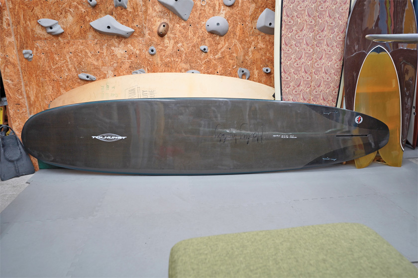 ユーズド、トゥルハーストの9’4”ダイヤモンド・ドライブです。サンダーボルト製のジオン・カーボン仕様で軽量で丈夫な一本。デッキは素材が強いので画像程度のフットマークが見受けられる程度。そのほか画像のようにステッカーを剥がした痕、塗装の剥がれや小さなアタリなどが見受けられるコンディションでしょう。フィンセットの付属はありません。ハーレー本人のサインがボトムに入っております。(表面にマジックで書いた感じですので、リムーバーでふくと消えてしまうでしょう)