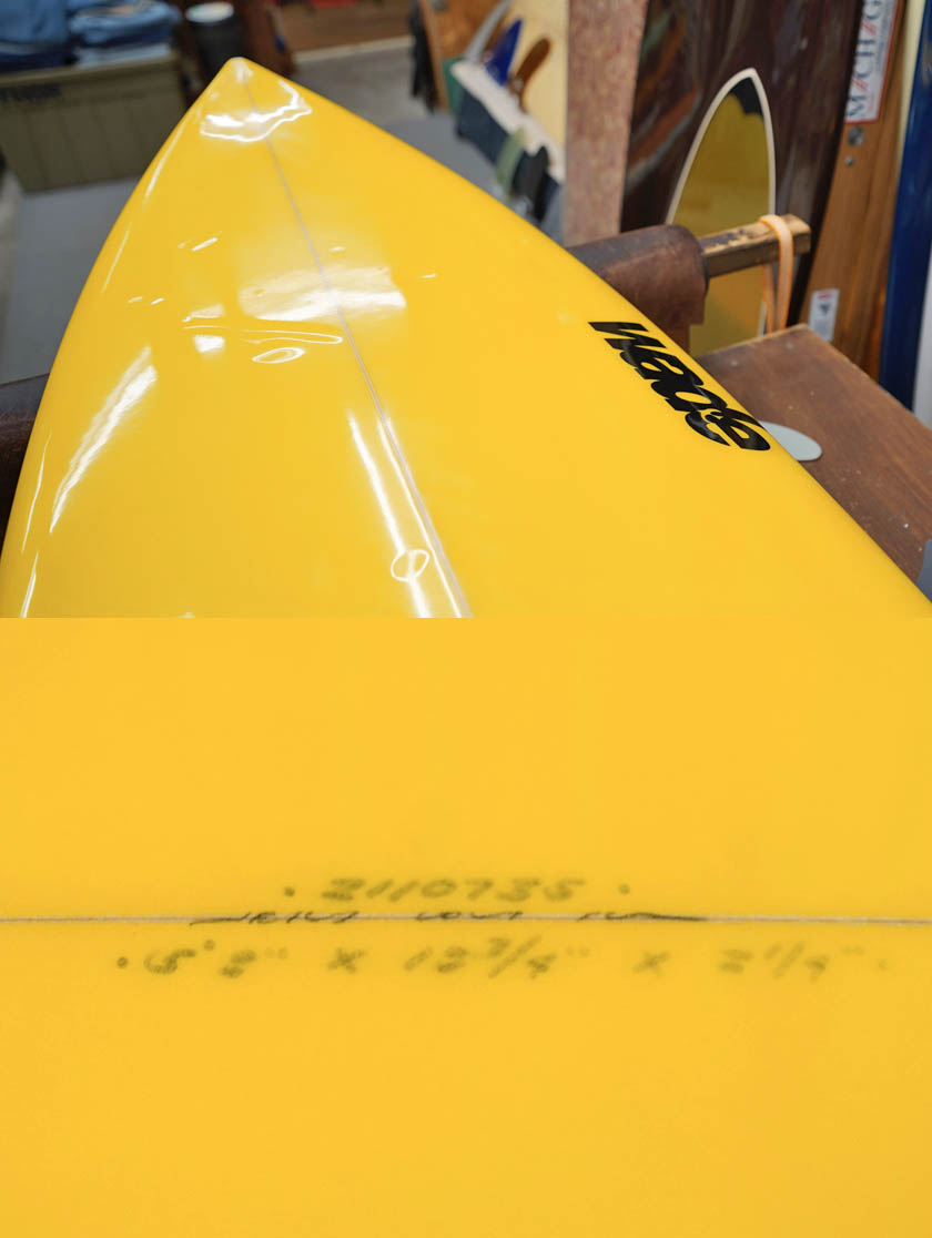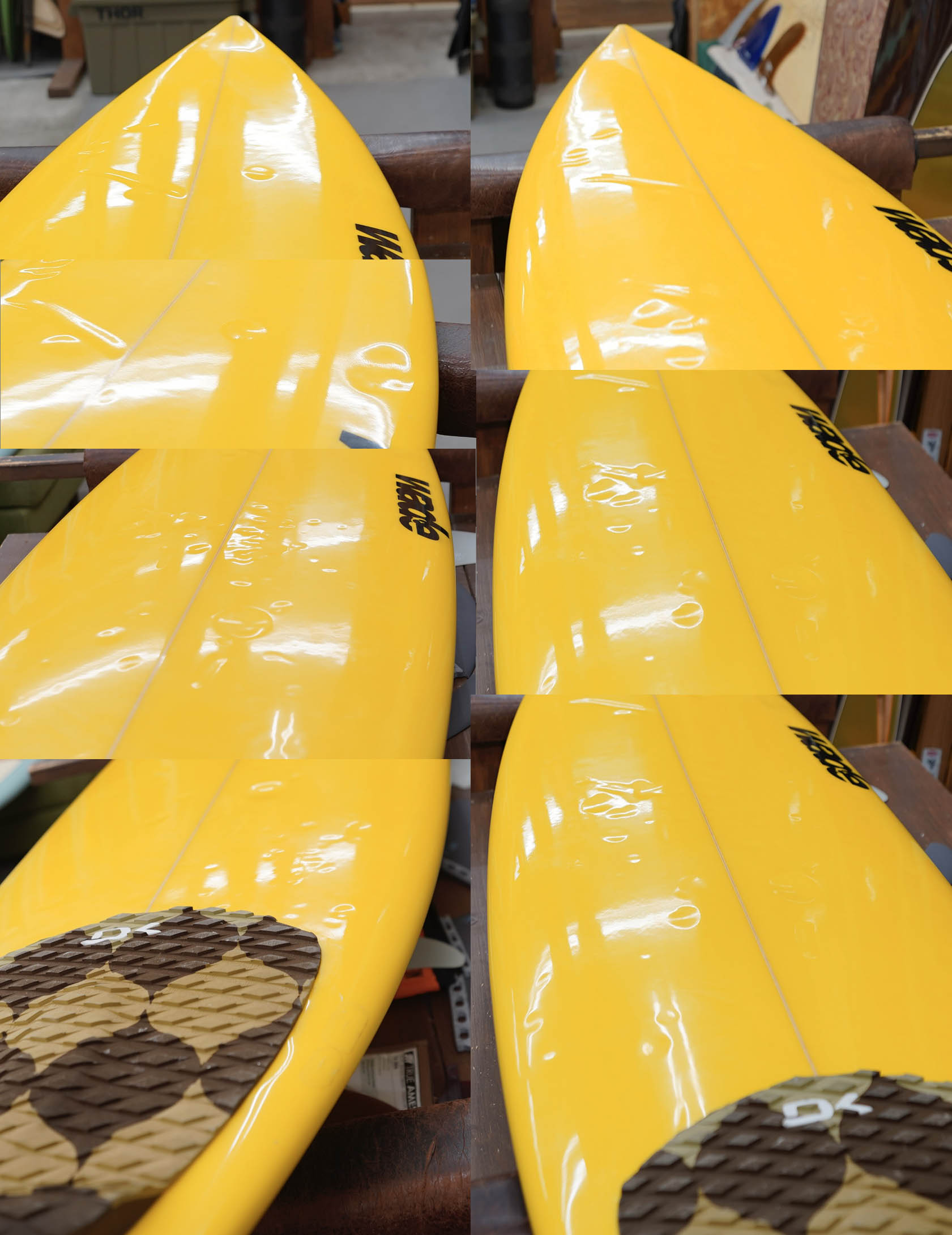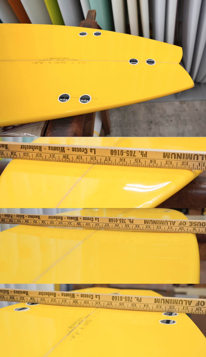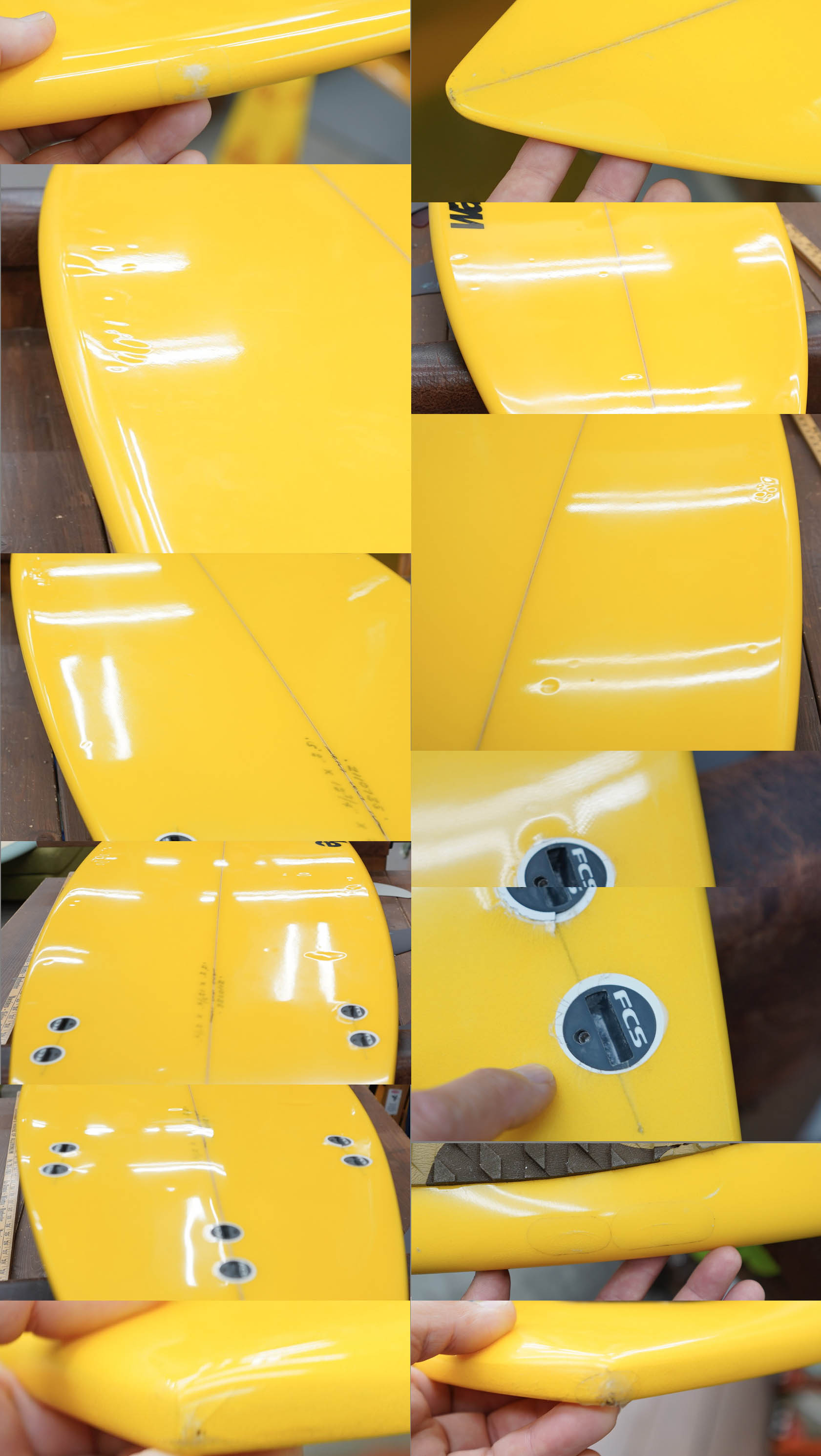 ニュー・エボリューションのユーズド・サーフボードは、ショートレングスからロングボードまで、個性豊かで充実したラインナップ。出来る限り分かりやすいコンディションの説明で、開業より20年以上日本各地の多くの皆様に販売を続けております。 あくまでもユーズドなので、コンディションについて気になる点がある場合は、お気軽にメールにてお問い合わせください。 尚、出来るだけお求めやすい金額でご提案させていただけるよう、ユーズドボードにつきましては現金特価とさせていただいております。カード決済ご希望の場合は、ご相談ください。 Tokoro Shortboard 5'9" * 19&3/4" * 2&1/4" Gloss & polish, yellow tint both side, lreash cup, fcs tri plug. (fin set not included) ユーズド、トコロの5’9”トライフィン・ショートボードです。最近おシェイプではありませんが、しまったままになっていたのでどなたか乗って頂ければという一本です。画像程度のフットマーク、ボトムに満遍なく小さな凹み、レールにテープを貼ったあたり数個、テールエンドに日々とセルフリペアーあり。またプラグが2個(フィン一個分)用リペアーです。フィンセットの付属はありません。
