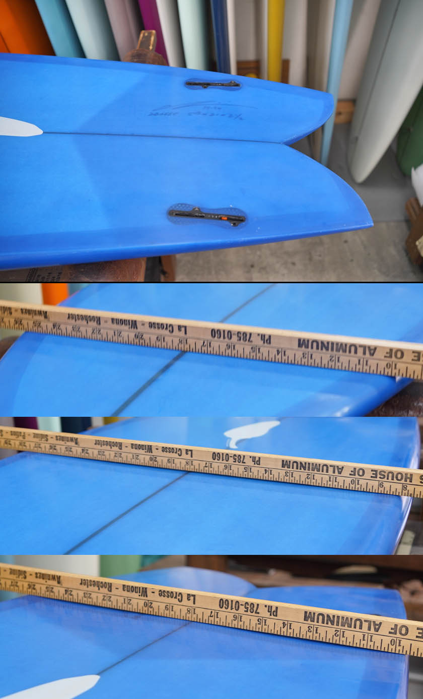 ユーズド、チリの5’8”シュガーです。シュガー専用のマークではなくチリのマーク入りの一本は割と珍しいそうです。デッキには軽い位置ラウンド使用した分のフットマークが数個が見受けられるだけのまだ新しさが感じられるコンディションでしょう。が沿いにあるテールの白い部分は制作時のホットコートなどのムラでダメージではありません。フィンの付属はありません。