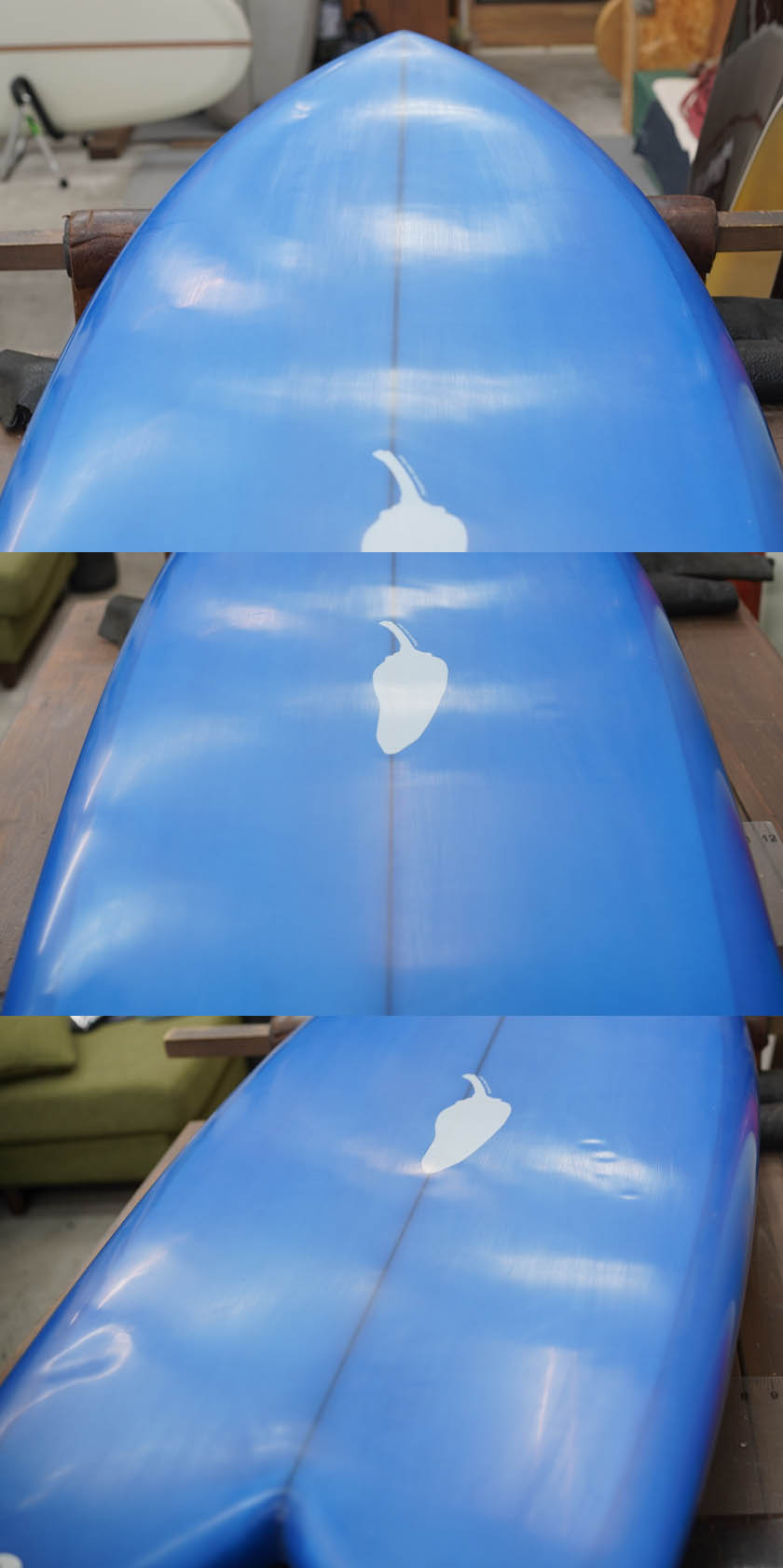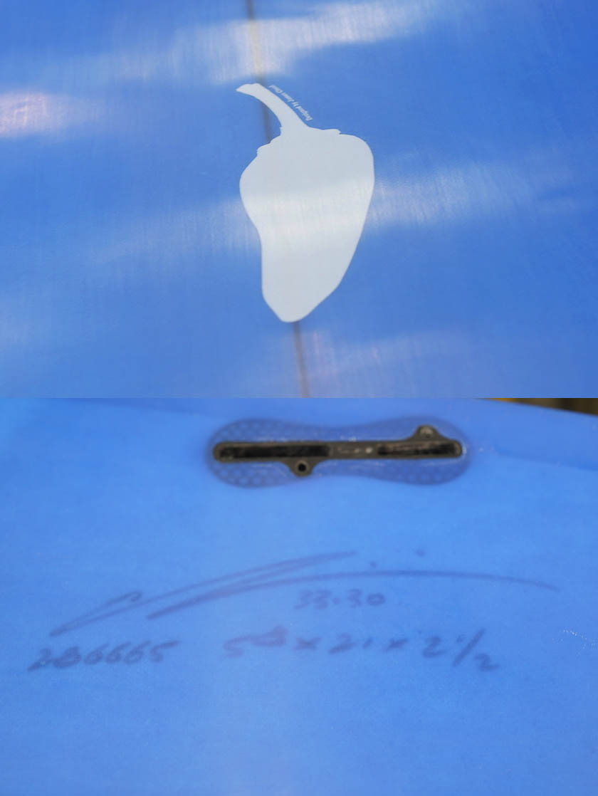 ニュー・エボリューションのユーズド・サーフボードは、ショートレングスからロングボードまで、個性豊かで充実したラインナップ。出来る限り分かりやすいコンディションの説明で、開業より20年以上日本各地の多くの皆様に販売を続けております。 あくまでもユーズドなので、コンディションについて気になる点がある場合は、お気軽にメールにてお問い合わせください。 尚、出来るだけお求めやすい金額でご提案させていただけるよう、ユーズドボードにつきましては現金特価とさせていただいております。カード決済ご希望の場合は、ご相談ください。 Chilli Sugar 5'8" * 21" * 2&1/2" Wetsand & gloss, blue tint top & bottom, dark wood stringer, fin patch, leash cup, fcs twin plug. (fin set not included) ユーズド、チリの5’8”シュガーです。シュガー専用のマークではなくチリのマーク入りの一本は割と珍しいそうです。デッキには軽い位置ラウンド使用した分のフットマークが数個が見受けられるだけのまだ新しさが感じられるコンディションでしょう。が沿いにあるテールの白い部分は制作時のホットコートなどのムラでダメージではありません。フィンの付属はありません。