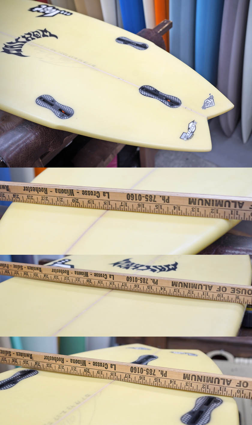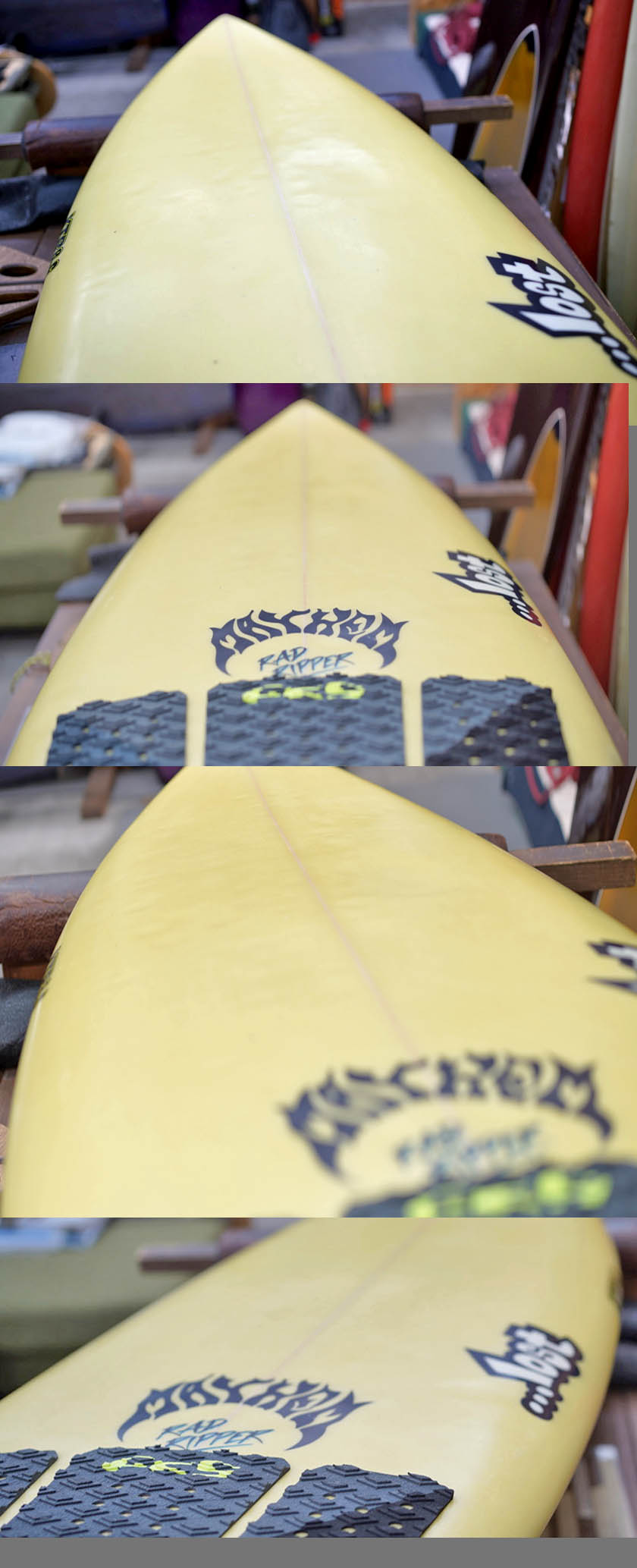 ニュー・エボリューションのユーズド・サーフボードは、ショートレングスからロングボードまで、個性豊かで充実したラインナップ。出来る限り分かりやすいコンディションの説明で、開業より20年以上日本各地の多くの皆様に販売を続けております。 あくまでもユーズドなので、コンディションについて気になる点がある場合は、お気軽にメールにてお問い合わせください。 尚、出来るだけお求めやすい金額でご提案させていただけるよう、ユーズドボードにつきましては現金特価とさせていただいております。カード決済ご希望の場合は、ご相談ください。 Lost Rad Ripper 5'7" * 19.43" * 2.37" 29.12L XTR 8.C, Epoxy Pro, yellow color, leash cup, fcs II tri plug. (fin set not included) ユーズド、ロスト・メイヘムの5’7”ラッド・リッパーです。XTR8.Cとエポキシ・プロの組み合わせプラス、ウィング・スワローテールのトライフィンでカッコいいリッピングを決めまくちゃってください。デッキのフットマークはわかりづらいので、画像を加工して目立つようにしてみました。そのほかダメージや凹みなど見受けられないコンディションでしょう。フィンセットの付属はありません。