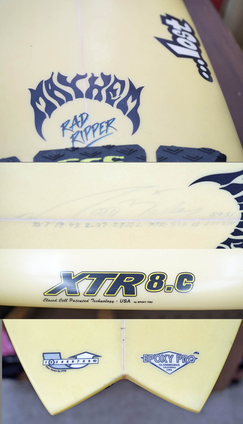 ユーズド、ロスト・メイヘムの5’7”ラッド・リッパーです。XTR8.Cとエポキシ・プロの組み合わせプラス、ウィング・スワローテールのトライフィンでカッコいいリッピングを決めまくちゃってください。デッキのフットマークはわかりづらいので、画像を加工して目立つようにしてみました。そのほかダメージや凹みなど見受けられないコンディションでしょう。フィンセットの付属はありません。